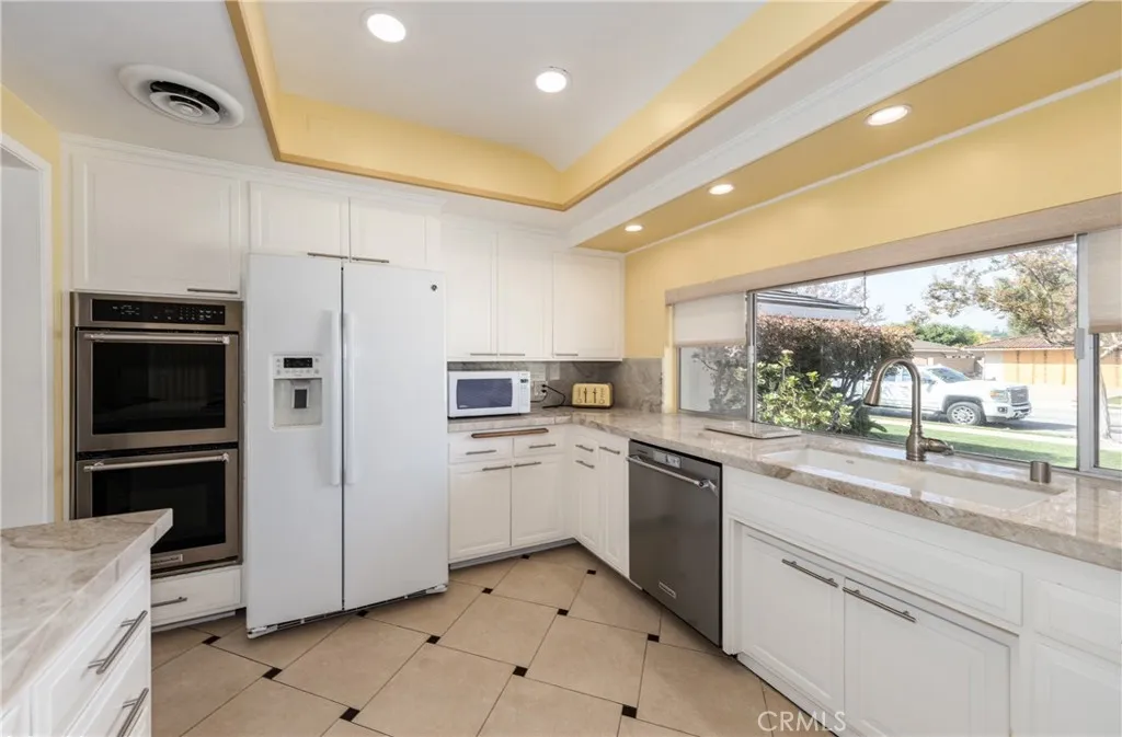 The heart of the home is the bright, beautifully updated kitchen, with white cupboards, granite countertops with backsplash, featuring stainless steel appliances including two ovens, a modern stove, a built-in exhaust vent, and plenty of counter space for cooking and entertaining. The kitchen opens to a welcoming family dining area with access to the lovely patio and backyard. A cozy den off the dining area and wet bar with sink and mini-fridge is perfect for family time or casual gatherings. A convenient indoor laundry room and powder room off the kitchen add function and ease to daily living.