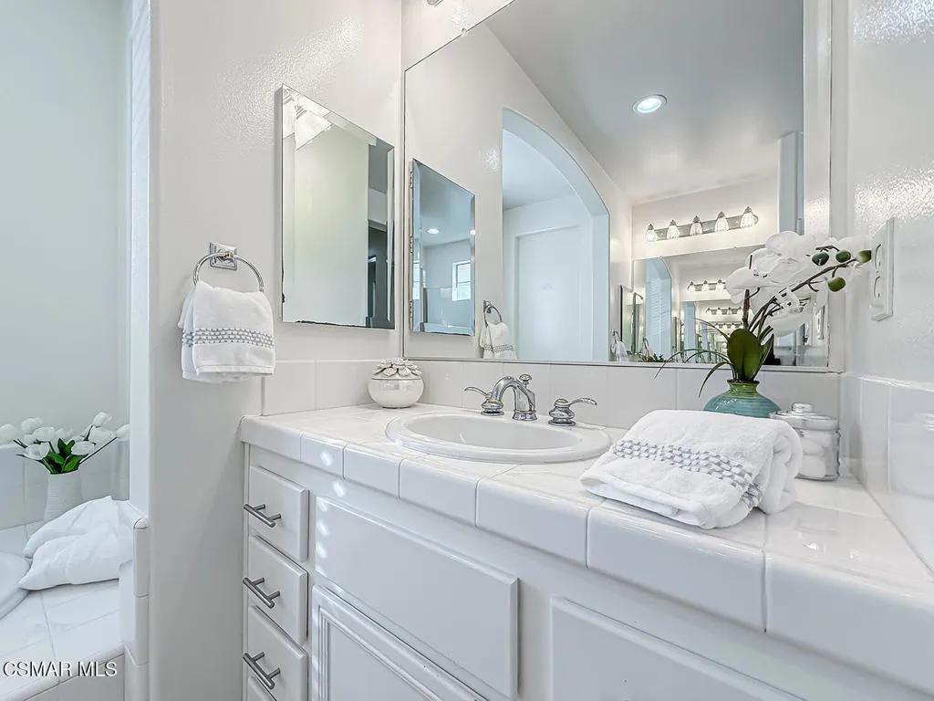Welcome to this beautifully updated home offering 4 bedrooms, 2.5 baths, and a spacious bonus room perfect for everyday living. A soaring cathedral ceiling at the entry and gorgeous wood flooring throughout create a warm, inviting atmosphere. Thoughtful details such as designer paint, ceiling fans, and custom touches combine style with comfort. The formal dining room, highlighted by a chandelier and sliding doors to the side yard, flows seamlessly into the living room with a cozy fireplace. The gourmet kitchen showcases an extended center island, elegant quartz counters, sleek white cabinetry, and a farmhouse sink – opening to the family room complete with a second fireplace, making it the ideal gathering spot. Upstairs, the primary suite offers a true retreat with dual closets featuring custom built-ins and a spa-inspired bathroom with dual vanities, soaking tub, and separate shower. Three additional bedrooms, a generous bonus room, and convenient upstairs laundry complete the second level. Enjoy the private backyard with picturesque mountain views, a covered patio, lush landscaping, and a spacious grassy area – perfect for entertaining or relaxing. A 3-car garage with built-in cabinets provides ample storage. Located in a prime neighborhood, close proximity to Sycamore Canyon K-8 School, parks and The Village. Exceptional!