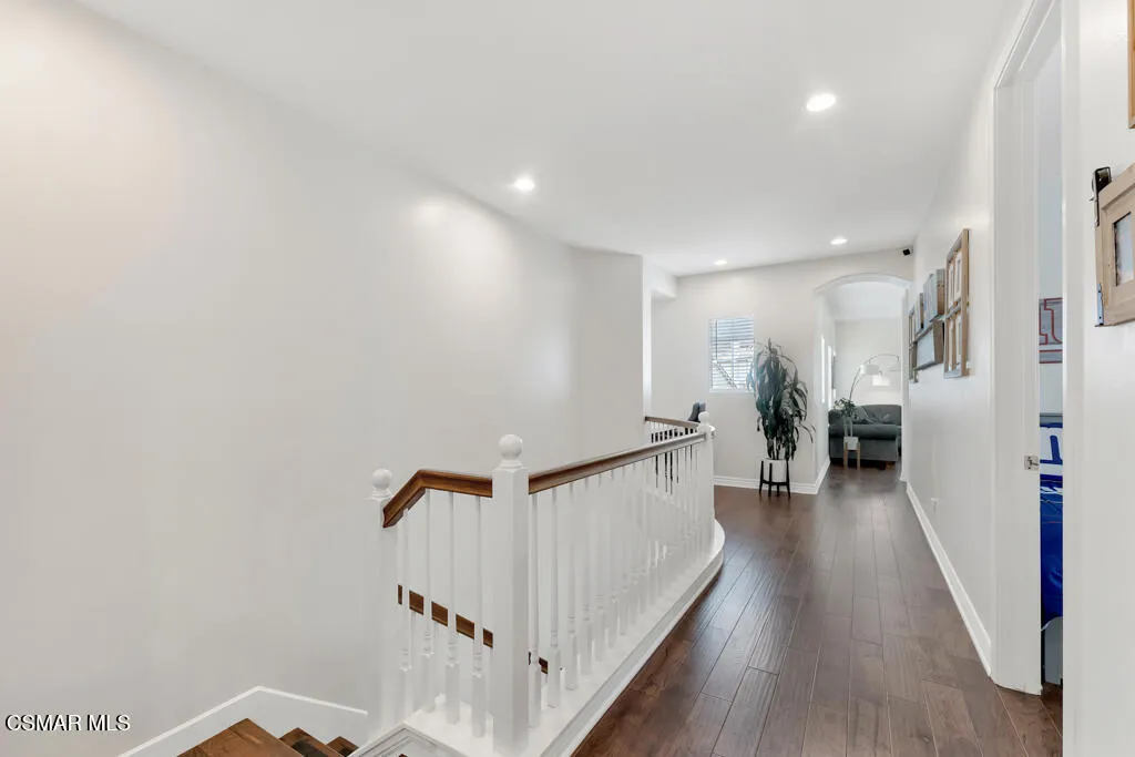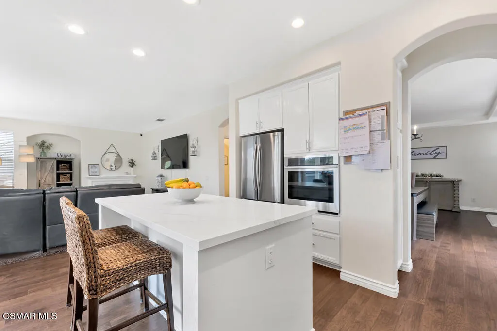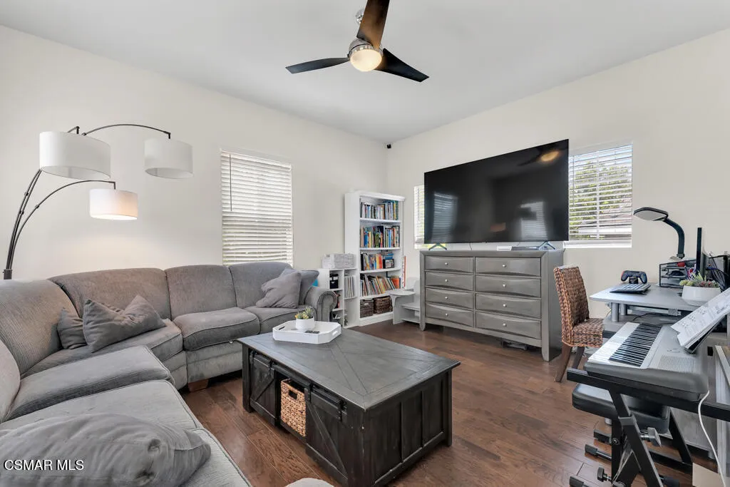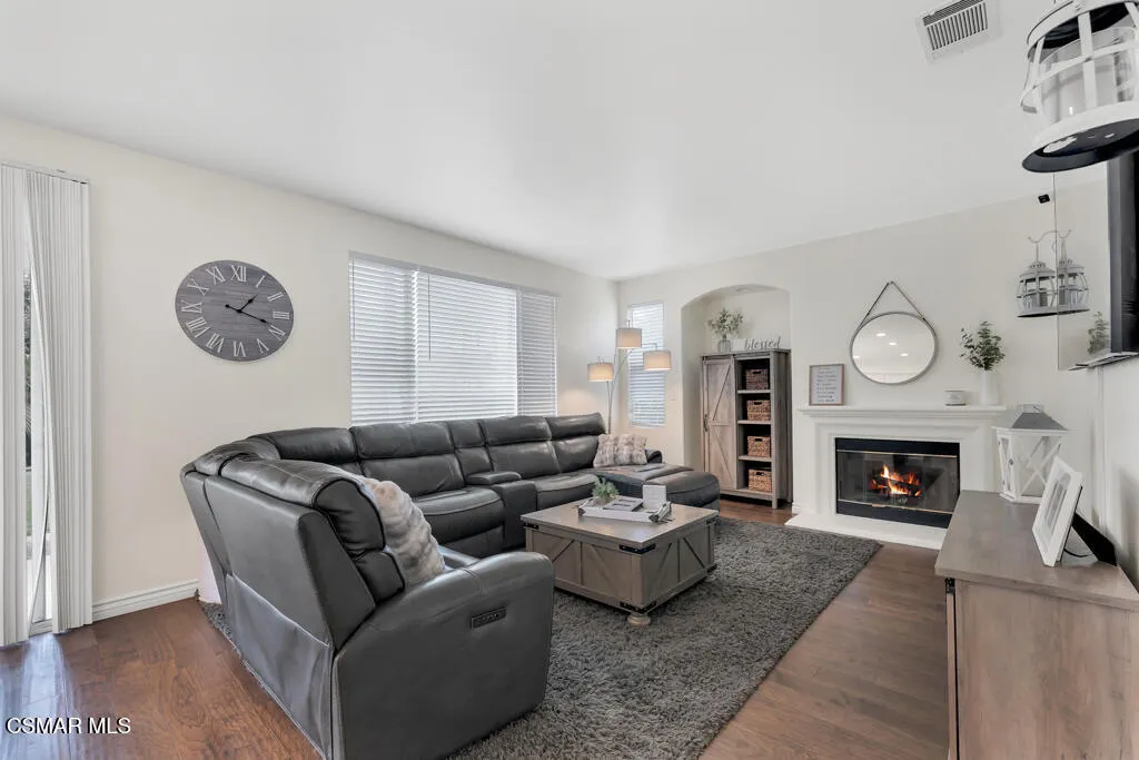 Welcome to this beautifully updated home offering 4 bedrooms, 2.5 baths, and a spacious bonus room perfect for everyday living. A soaring cathedral ceiling at the entry and gorgeous wood flooring throughout create a warm, inviting atmosphere. Thoughtful details such as designer paint, ceiling fans, and custom touches combine style with comfort. The formal dining room, highlighted by a chandelier and sliding doors to the side yard, flows seamlessly into the living room with a cozy fireplace. The gourmet kitchen showcases an extended center island, elegant quartz counters, sleek white cabinetry, and a farmhouse sink – opening to the family room complete with a second fireplace, making it the ideal gathering spot. Upstairs, the primary suite offers a true retreat with dual closets featuring custom built-ins and a spa-inspired bathroom with dual vanities, soaking tub, and separate shower. Three additional bedrooms, a generous bonus room, and convenient upstairs laundry complete the second level. Enjoy the private backyard with picturesque mountain views, a covered patio, lush landscaping, and a spacious grassy area – perfect for entertaining or relaxing. A 3-car garage with built-in cabinets provides ample storage. Located in a prime neighborhood, close proximity to Sycamore Canyon K-8 School, parks and The Village. Exceptional!