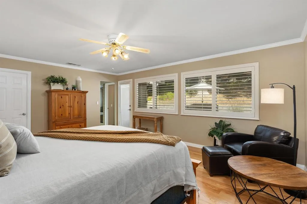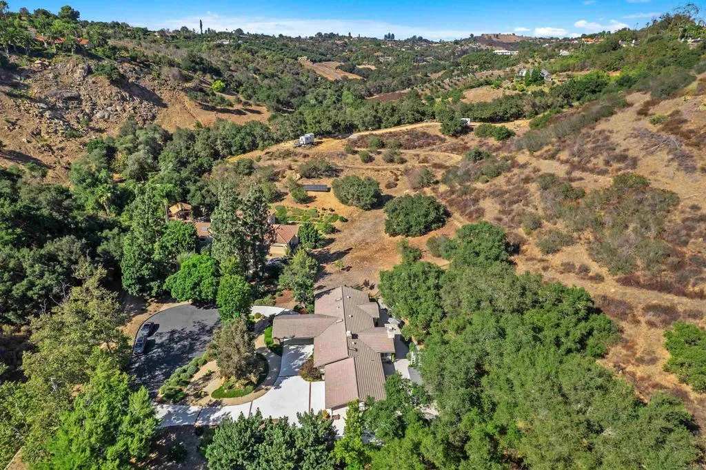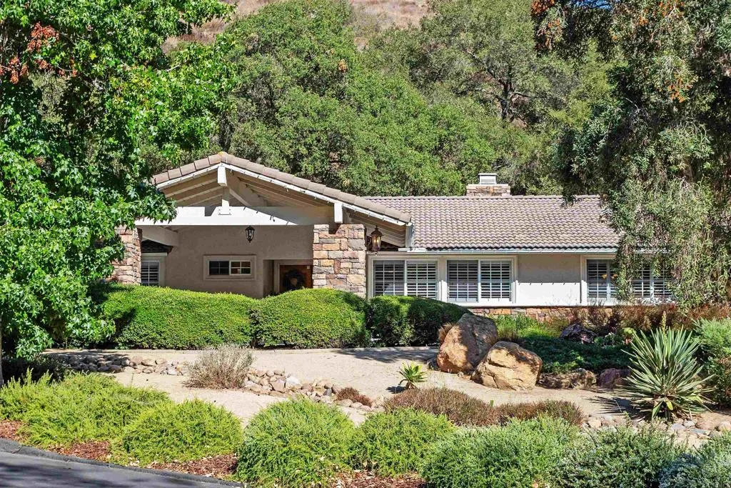 Serenity and privacy are effortlessly embodied within the highly coveted, and gated community, Secret Lake Lane in Fallbrook. Nestled on a scenic, tree-lined cul-de-sac, with a grand entrance that boasts a circular driveway, an elegant roofed porte cochère, a spacious three-car garage, and meticulously landscaped grounds. All accented by subtle tree lighting, which elevates the estate’s sophisticated design. This single-level residence spans 2,614 square feet and features four bedrooms, two and a half bathrooms, walk-in closets, a luxurious spa tub, and double vanities in both bathrooms. Sunlight gracefully filters through three skylights, highlighting the stunning vaulted wood ceilings, a striking floor-to-ceiling fireplace, natural hardwood floors, plantation shutters, and an additional fireplace in the living room. The gourmet kitchen showcases elegant sage and chocolate granite countertops, complemented by a matching wine bar, perfect for entertaining. Thoughtfully designed for versatility, privacy doors between the dining and living areas can be opened for social gatherings or closed for an intimate ambiance. The expansive 1.1-acre parcel is fenced and features meandering gravel paths weaving through nine ancient oak trees, illuminated by a sophisticated lighting system that highlights the outdoor beauty of the landscape. The outdoor living space boasts a charming flagstone fire pit with a pony wall, while privacy deco walls and a 16’x20’ Ramada with sun shades provide a cool, secluded retreat. For ultimate relaxation and entertaining, enjoy a seven-person spa, multiple patio seating areas, an outdoor fire pit, and an outdoor built-in sink. A separate side lot offers endless possibilities for a lush garden or personal creative endeavors. Located just minutes from Monserate Winery, Highway 76 and Golf Club of California, this remarkable estate offers a private sanctuary, blending natural beauty, sophisticated design, and exceptional privacy for an extraordinary lifestyle.