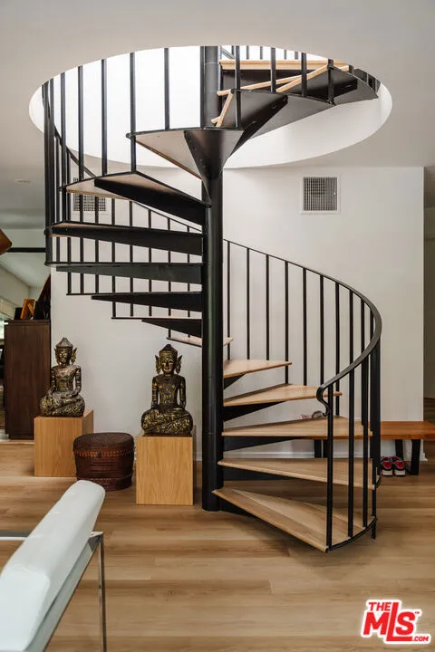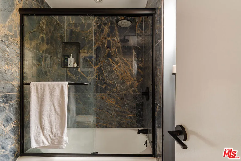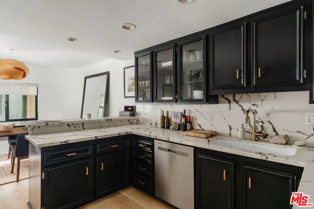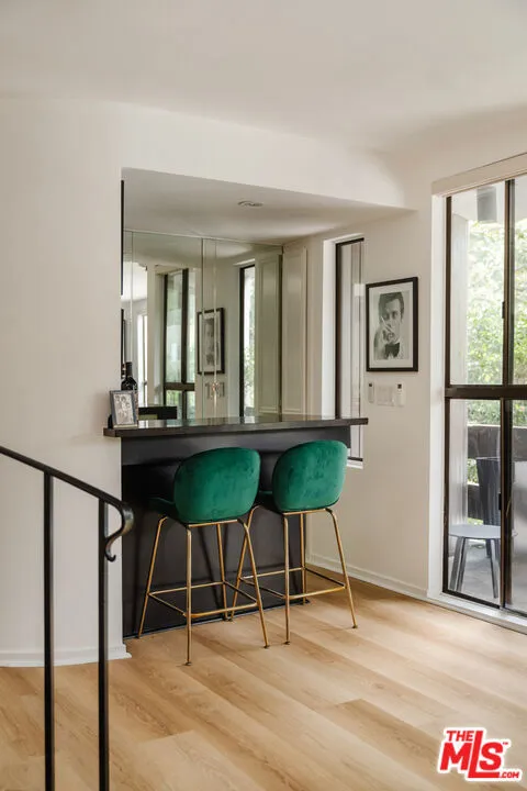 Tucked within one of the few condominium enclaves in the prestigious Bel Air neighborhood, this rare two-level townhome blends architectural style, modern comfort, and serene indoor-outdoor living. One of just seven residences and only sharing one wall with neighbors, the home offers a refined retreat amid a setting typically reserved for grand estates. Upon entry, a light-filled living space welcomes with floor-to-ceiling windows, a sleek gas fireplace, and seamless access to a covered balcony framed by leafy treetops–an idyllic perch for morning coffee or evening repose. The adjacent kitchen makes a striking statement with matte black cabinetry, brushed brass hardware, and quartz countertops, punctuated by Viking double ovens and a dedicated wine fridge. A stylish dining area and a built-in wet bar enhance the lower level, ideal for everything from quiet mornings to lively entertaining. Upstairs, a skylight above the spiral staircase allows radiant natural light to fill the space. A private wood-clad courtyard offers a rare al fresco moment–an intimate outdoor escape just outside the bedroom suites. Both bedrooms are generously scaled and feature en suite baths, providing comfort and privacy. The primary suite is graced with oversized windows and ample storage, while its recently updated bathroom includes a tiled soaking tub beneath a skylight and glass-enclosed shower, creating a spa-like sanctuary. Glass block detailing adds a retro-chic flourish to the upper hall, and a stacked laundry closet offers everyday convenience without compromising design. Ideally located for those who seek privacy without isolation, this Bel Air gem is just minutes from The Getty Center, Brentwood Village, Westwood, and the 405 freeway–pairing tranquil living with effortless access to the best of the Westside.