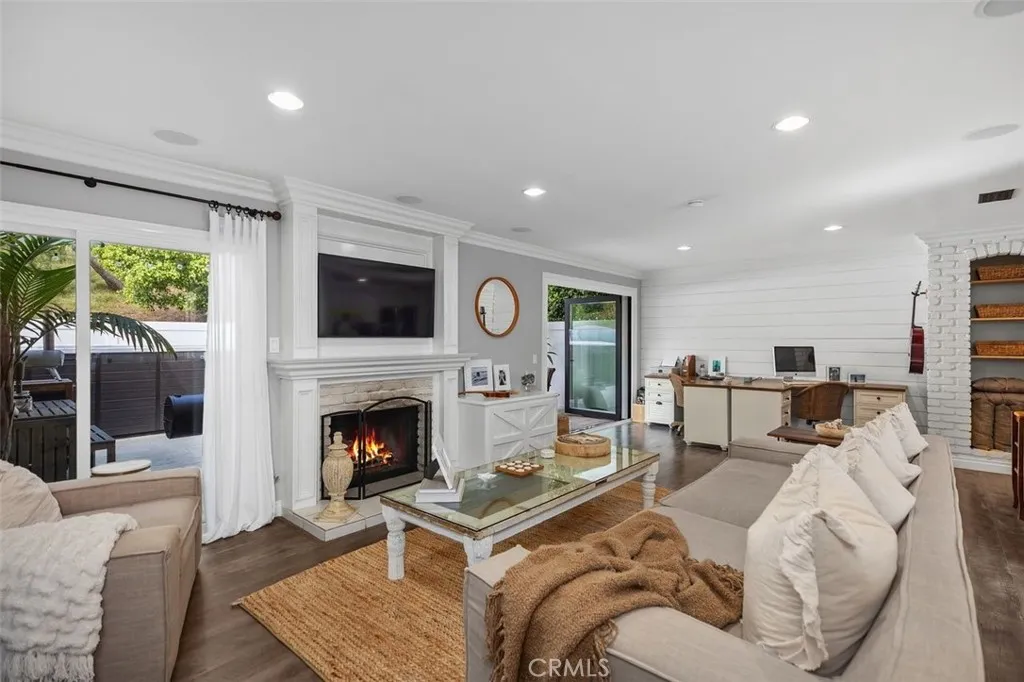 Upstairs are three bedrooms, including a primary suite that can be reconfigured into four bedrooms if desired. The primary suite includes dual closets, a fireplace with sitting area, and a private deck with views of the landscaped greenbelt. Additional upgrades include Energy Star A/C and HVAC, dual-pane windows and doors, enhanced electrical, built-in garage storage and workbench, new flooring, driveway, and roof.