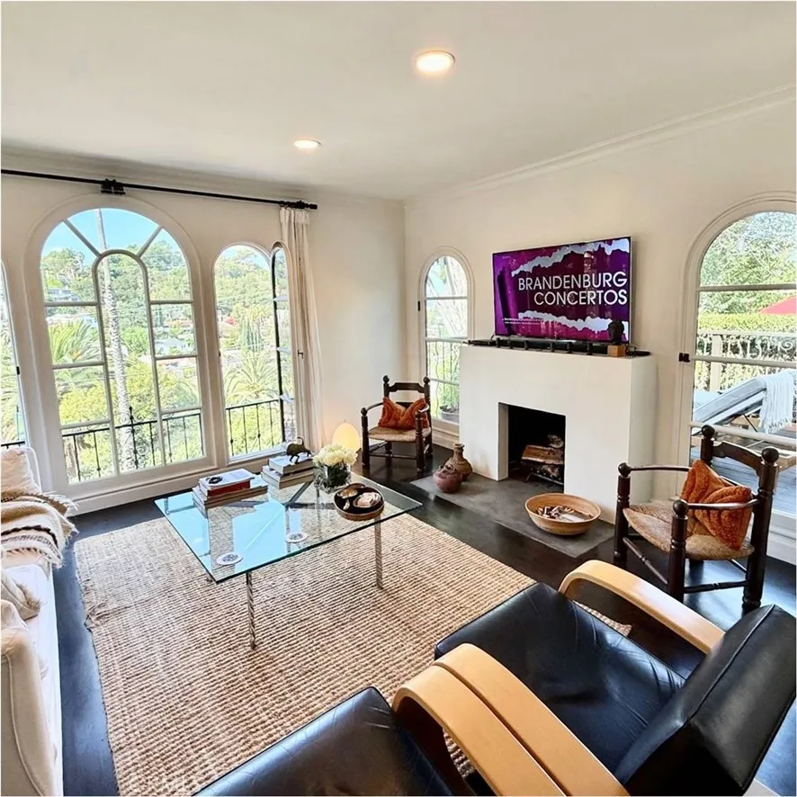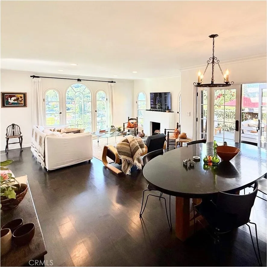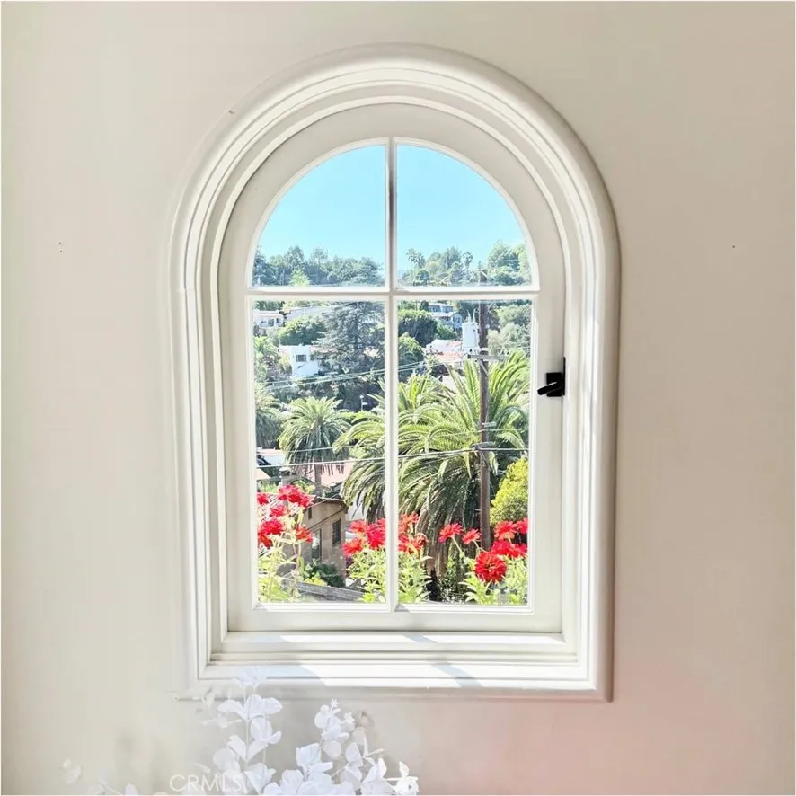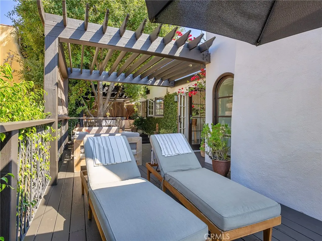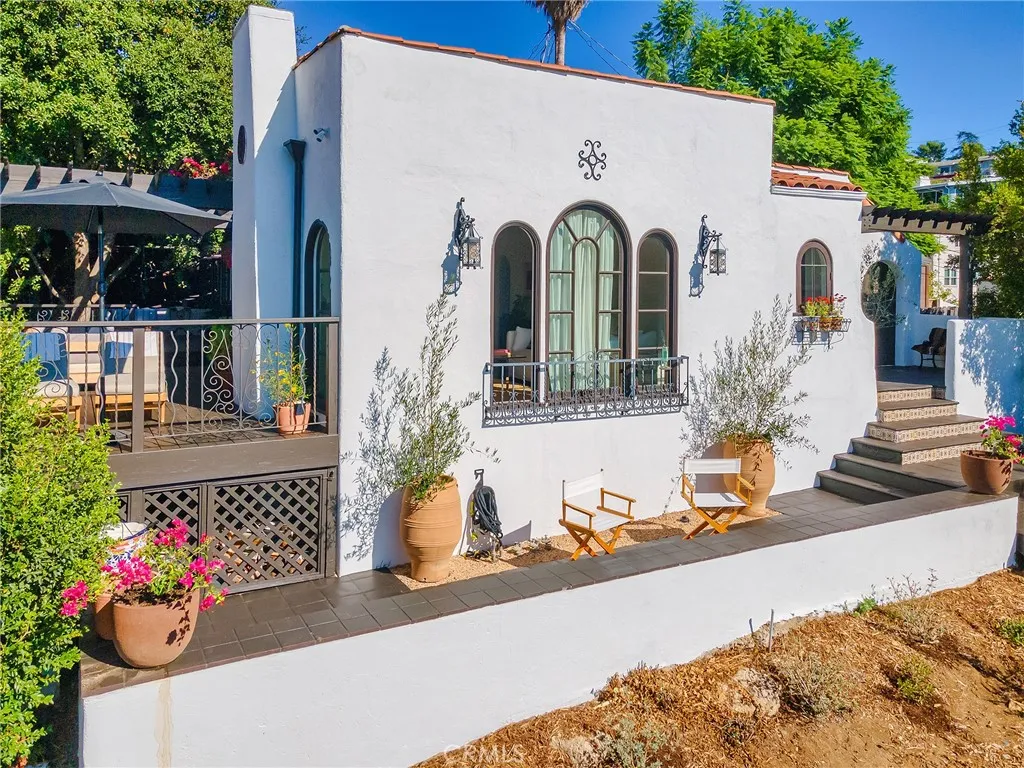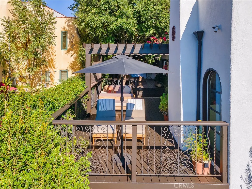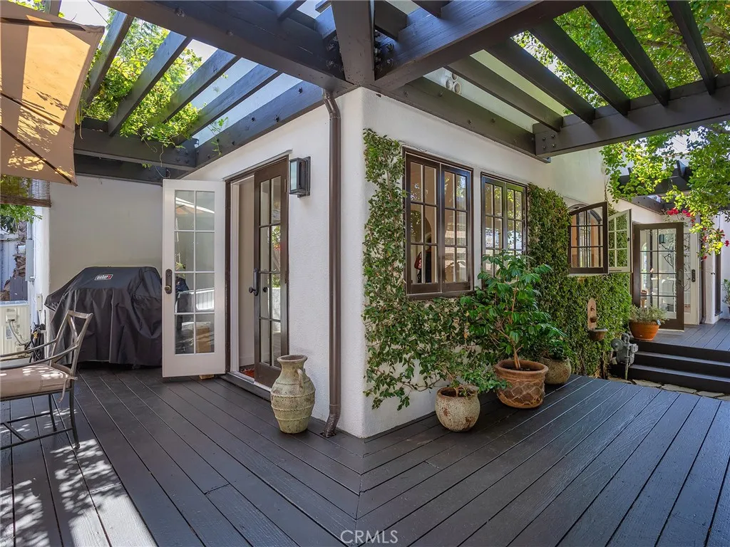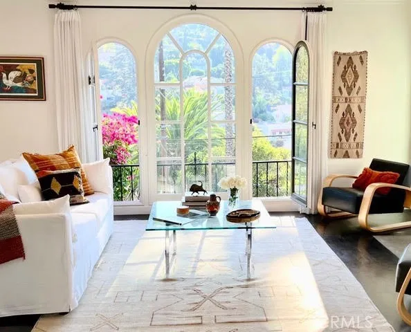 Inside, graceful archways frame the entries and hallways, while abundant French doors and Spanish-style windows bathe the interiors in natural light. Pure walnut floors add timeless richness underfoot, while original Wallace Neff lighting fixtures cast a warm, historic glow. Step outside to 600 square feet of wraparound decks with multiple spaces for entertaining or quiet retreat.