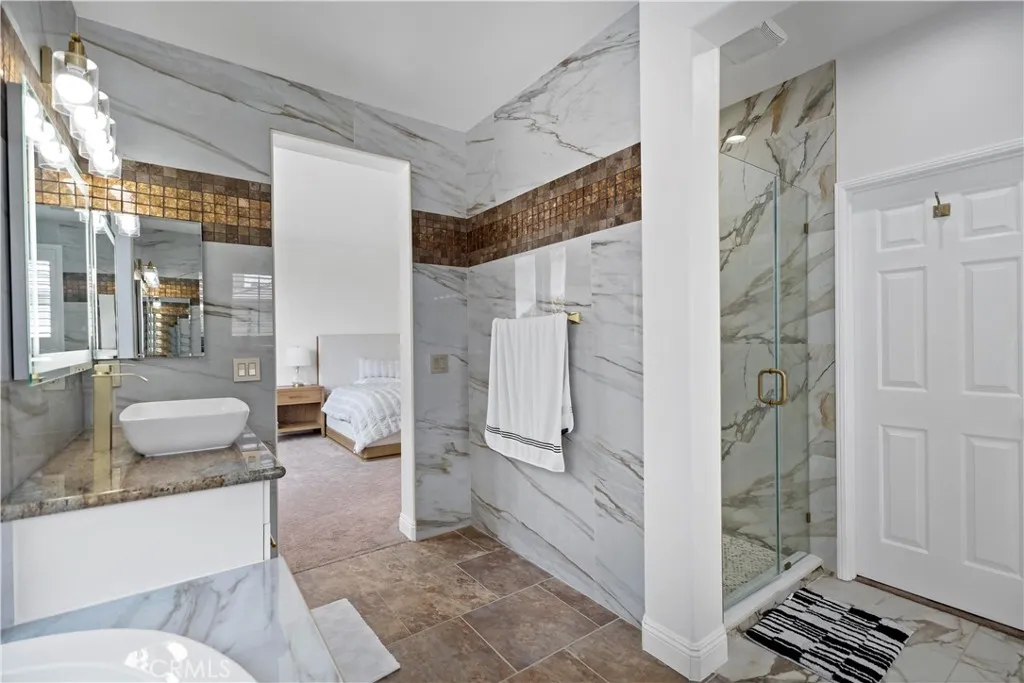 Beautifully upgraded 4 bed, 3 bath home located in the desirable Jolimont community of Rancho Cucamonga. This spacious and airy two-story home features fresh interior paint, recessed lighting, upgraded flooring, crown molding, and designer draperies throughout. The gourmet kitchen is equipped with new white cabinetry, granite countertops, and a Wolf high-performance range, opening to a large family room—perfect for entertaining.Downstairs includes a full bedroom and remodeled bathroom with Spanish tile and a large walk-in shower, ideal for guests or multi-generational living. Upstairs, the oversized primary suite offers a retreat space that can be used as an office, lounge, or optional 5th bedroom. The spa-like primary bathroom has been remodeled with elegant marble tile throughout. All bedrooms are spacious with ample closet space and new mirrored doors.