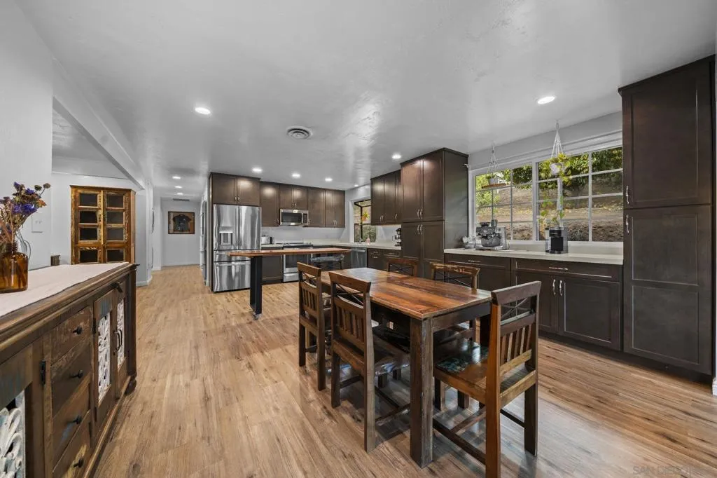 This beautifully updated single-level home in the desirable Rancho San Diego area of El Cajon offers a RARE FIVE-CAR garage setup, perfect for car enthusiasts or those in need of ample storage and workspace. It includes an attached 2-car garage and a custom-built 3-car garage with high ceilings that can accommodate tandem parking for certain vehicles. The garage also features a tankless water heater, adding to the home’s modern conveniences. The home offers 3 bedrooms, 2 bathrooms, and 1,866 square feet of living space on a peaceful hillside lot. The home sits on a usable half-acre and features a resurfaced pool with a new pump in a private, fenced-in area with synthetic turf—ideal for relaxing or entertaining, with direct access from the home. Inside, the kitchen has been fully remodeled with soft-close custom cabinetry, stainless steel appliances, a built-in wine fridge, and a coffee bar. There are two separate living areas, each with its own fireplace, creating flexible and comfortable spaces. Additional updates include high-end dual-pane windows, a newer HVAC system, and a FULLY PAID 20-PANEL SOLAR SYTEM for energy efficiency. The exterior has been treated with a $30,000 “Cool Wall” energy-efficient paint system. There’s also a private driveway, RV parking, and three additional storage sheds. The property includes mature fruit trees and plenty of open space, offering peace and quiet in a highly sought-after neighborhood. Laundry hookups are available both inside the home and in the garage.