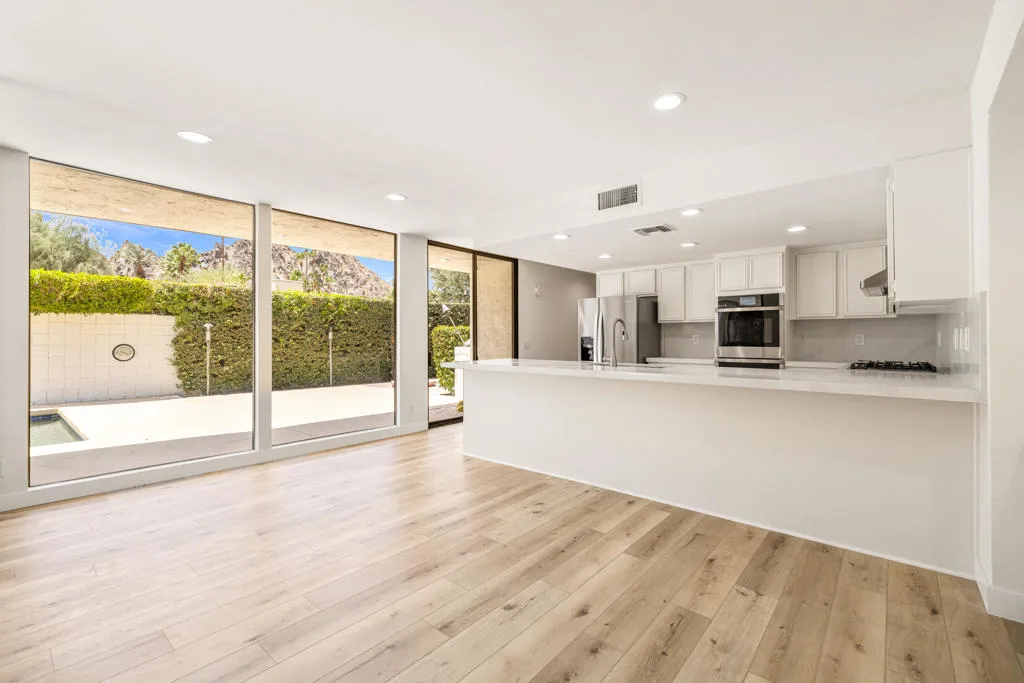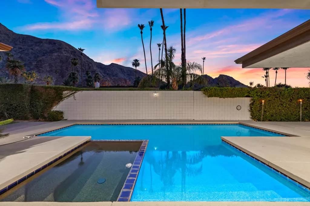 Beautiful and just remodeled mid-century modern home nestled within highly sought after Manitou Springs community at prestigious Indian Wells Country Club. Relax in the scenic backyard with breathtaking mountain views, pebble tech pool/spa and yard with lush flowers, palm and citrus trees. Home features 2 bedrooms, 2 ensuite baths, Powder Bath, 2260 Sq. ft interior living space, 2 cars plus golf cart garage, built in 1978. Home has seller owned solar energy for efficiency. Fabulous location on quiet cul-de-sac with pavered driveway and walkway. All new interior white painted walls and baseboards, new luxury vinyl wood plank floors throughout with neutral carpets in bedrooms and the Great Room, and new quartz countertops. Stunning entry into the open Great Room with high ceilings, sparkling pool and mountain views, walls of glass, and floor to ceiling new stone gas fireplace with onyx hearth. The Great Room has Wet bar with glass shelving. The open Kitchen includes all new stainless appliances, and gorgeous new quartz countertops with full backsplash, and ample bar seating. Adjacent to Kitchen boasting views galore, is a built-in desk with storage shelves so could be used as home office, or informal seating or dining area. Primary Bedroom has glass sliders out to covered patio. Spacious Primary Bath has new dual sinks, quartz countertops, a big shower and walk-in closet. Guest Bedroom has walk-in closet and new glass shower. Not to be missed this mid-century modern home tucked into guard-gated IWCC, and so close to world class shopping, golf, and the famous Tennis Gardens. Low HOA’s!