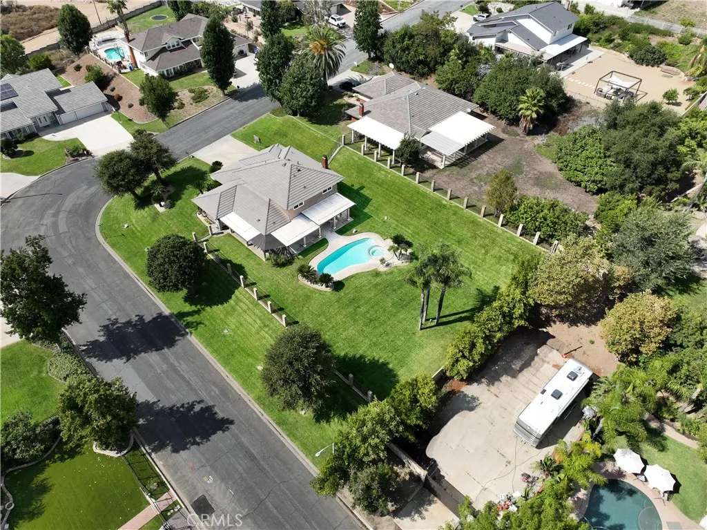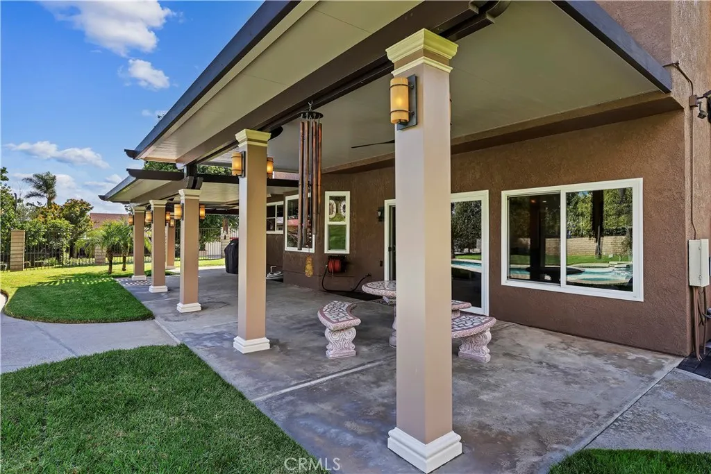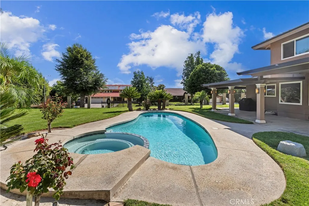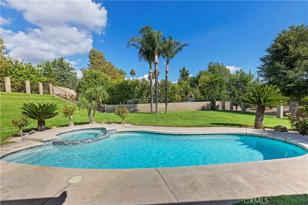 The rear yard is an entertainers dream with plenty of room & a sparking pool to host large gatherings. There is also a full length patio cover, ceiling fan & speakers. Other appointments include a 24 KW Generac to provide electricity if there is ever a power outage, eave lighting, crown molding, travertine flooring, upgraded garage with custom cabinets, epoxy floor, sink, insulated garage doors, side mount openers, lush landscaping to include 30 year old Chinese Banyan trees & Sago Palms.