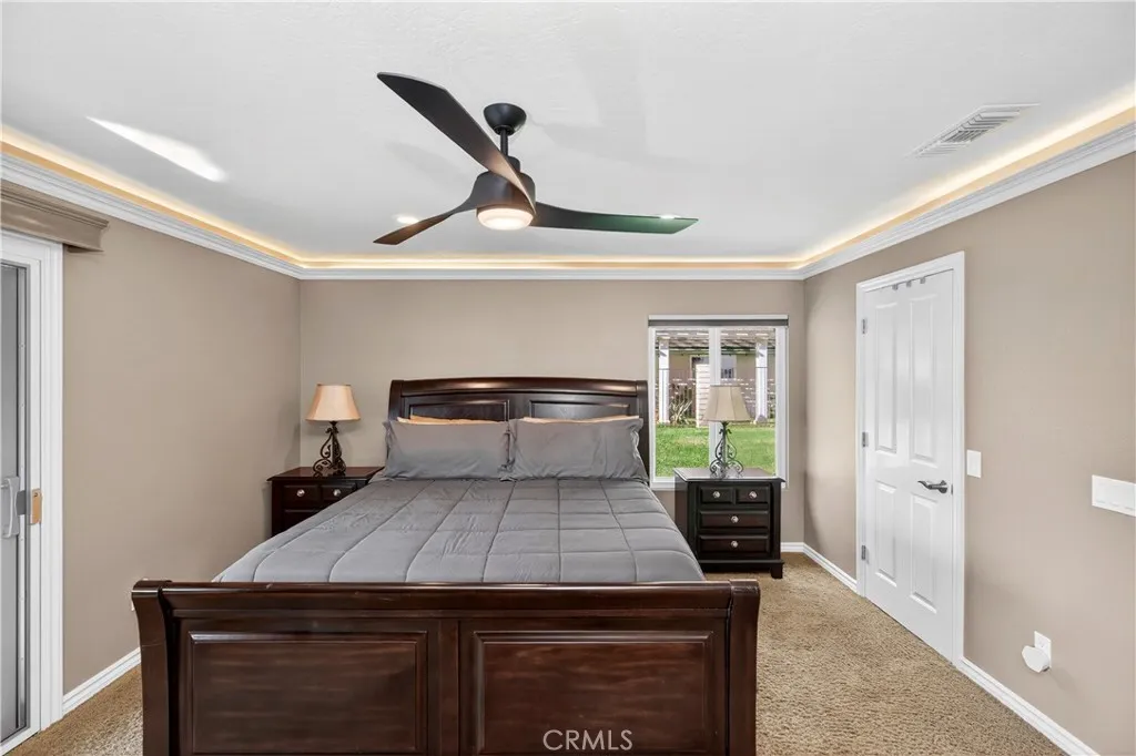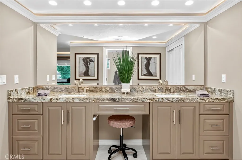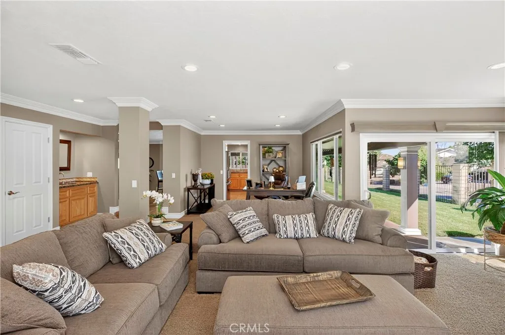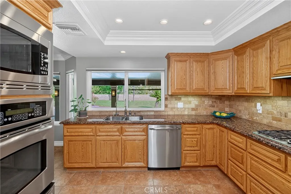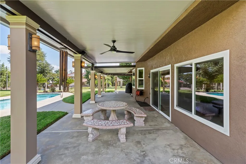 The rear yard is an entertainers dream with plenty of room & a sparking pool to host large gatherings. There is also a full length patio cover, ceiling fan & speakers. Other appointments include a 24 KW Generac to provide electricity if there is ever a power outage, eave lighting, crown molding, travertine flooring, upgraded garage with custom cabinets, epoxy floor, sink, insulated garage doors, side mount openers, lush landscaping to include 30 year old Chinese Banyan trees & Sago Palms.