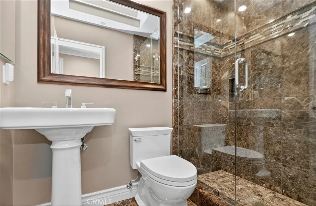 The gourmet kitchen is a chef’s dream, boasting stainless steel appliances, dual ovens, cook top, granite counters,under cabinet lighting, lazy Susan’s, soft close drawers & even a pocket door.. Whether you’re preparing a quick meal or hosting a lavish dinner party, this space will inspire culinary creativity. There is a first-floor bedroom offers convenience and flexibility, perfect for guests or as a private home office. The downstairs guest bath is elegantly appointed with dark emperor marble shower. Finishing off the downstairs is a family room with fireplace, upgraded mantel, surround sound speakers & breakfast nook area.