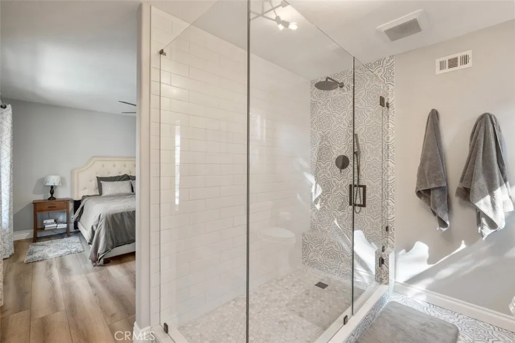 Inside, the efficient floor plan includes three bedrooms and is highlighted by a wood-burning fireplace, a custom reclaimed-wood bar, a spacious kitchen, a beautifully tiled primary bathroom, and an attached two-car garage. Large windows bring in abundant natural light and connect the living spaces to the outdoors, creating a relaxed, inviting atmosphere throughout.