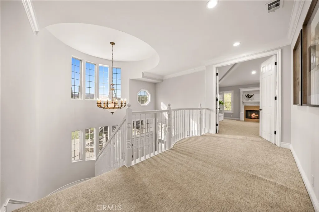Dual staircases lead upstairs to the luxurious oversized primary suite featuring a cozy retreat, fireplace, and private balcony. The spa-like primary bathroom includes a sunken jetted tub, marble flooring, dual vanities, a walk-in shower, and a generous walk-in closet. Three additional bedrooms (one en-suite), two full bathrooms, and a loft with access to a large viewing deck complete the second floor. The deck also provides direct access to the backyard.