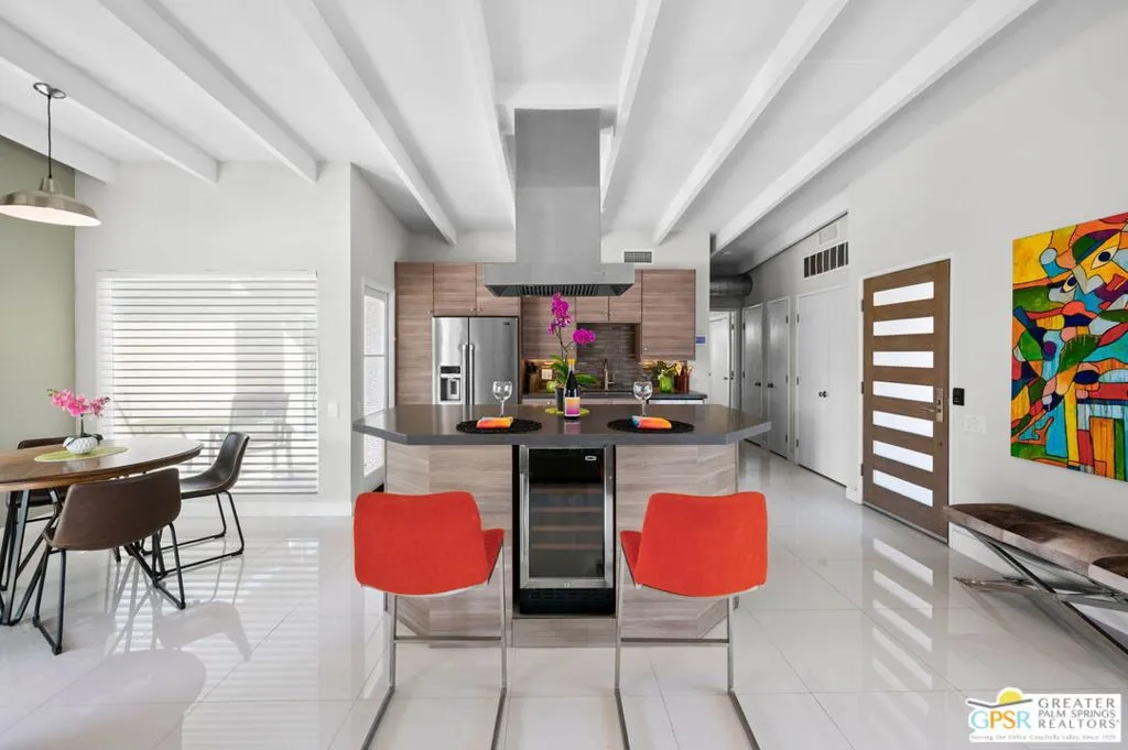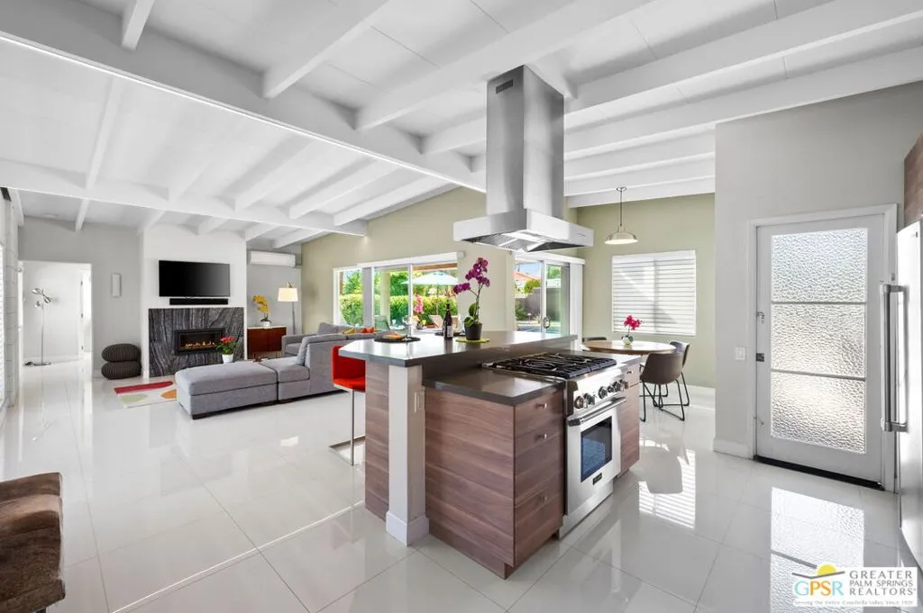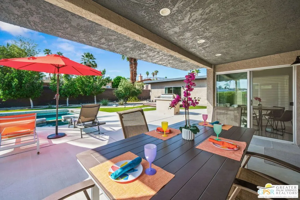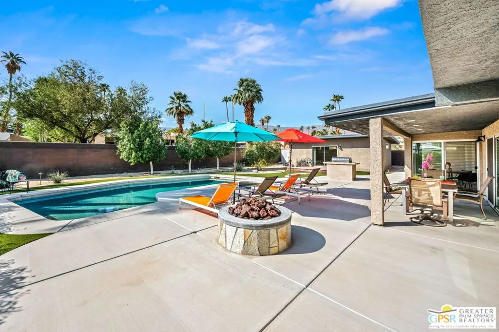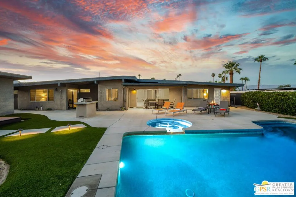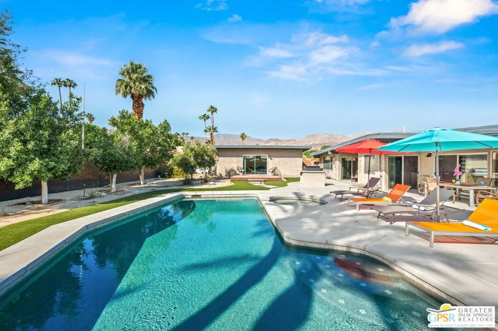 If location is everything, this home in the highly sought-after Silver Spur Ranch neighborhood of South Palm Desert truly delivers. Perfectly situated at the end of a quiet cul-de-sac, the property is South-facing and directly adjacent to Ironwood Park. Its curb appeal is exceptional, featuring striking redwood siding accents, a circular driveway, Milgard windows and doors, and a backdrop of swaying palm trees. This Mid-Century Modern gem underwent a complete renovation in 2018 and has been styled in a chic Contemporary design offering a move-in-ready, turnkey experience. Furnishings are included with just a few exceptions. Step into the backyard and you’ll be captivated by sweeping views and a resort-like setting, complete with a saltwater pool, spa, built-in BBQ, and gas fire pit all in a private, serene atmosphere. The detached casita provides a spacious third bedroom and bath, ideal for guests or a private retreat. Inside, the kitchen is a showpiece with an island bar, breakfast nook, Thermador range, and Maytag refrigerator. A fully owned solar system, installed in 2022 adds modern efficiency and value. Silver Spur Ranch, a charming historic neighborhood dating back to the 1950s, is celebrated for its diverse architecture and stunning mountain scenery. The home is minutes from El Paseo’s premier shopping and dining, directly across from the Living Desert, close to several golf courses, and just five minutes from scenic trailheads offering hikes from one to sixteen miles. This is a rare opportunity to own a dazzling, impeccably updated home in one of Palm Desert’s most desirable communities.