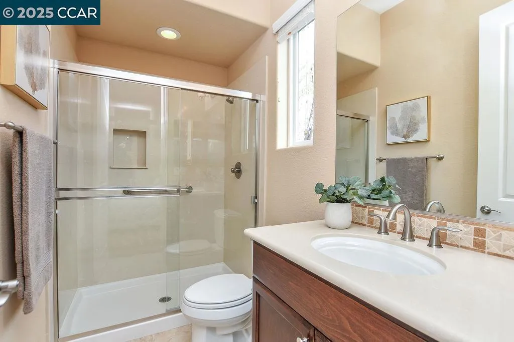 Discover resort-style living in this exquisite 2-bedroom, 2.5-bathroom home with a den/office, nestled within a prestigious 55+ gated community. Built in 2013, this 2,651 sq ft residence features a 3-car garage and a prepaid 20-year solar lease for added convenience. The spacious kitchen is equipped with double ovens, granite countertops, and an abundance of cabinetry. The inviting great room and cozy hearth room with a fireplace provide ample space for relaxation and entertainment. The primary suite features a generous walk-in closet and a luxurious bathroom with a separate shower and tub, dual sinks, and a dedicated vanity area. An ensuite guest bedroom ensures comfort for visitors. The professionally landscaped backyard boasts two overhangs, expansive patios, a firepit seating area, and vibrant plantings, creating an ideal setting for outdoor gatherings. Residents enjoy access to a clubhouse with a café, event center, spa, fitness center, and courts for pickleball, tennis, and bocce. Embrace an active and vibrant lifestyle in this exceptional community.