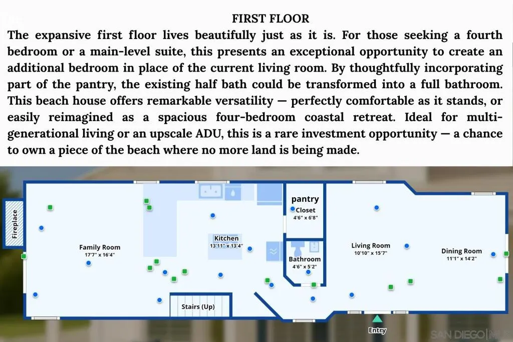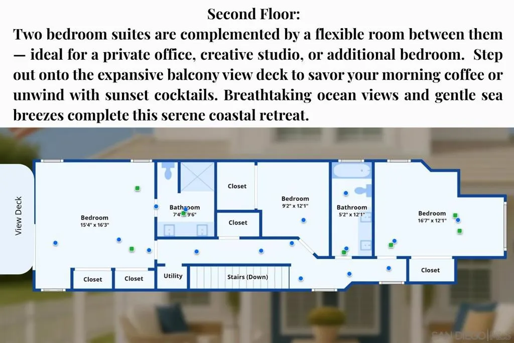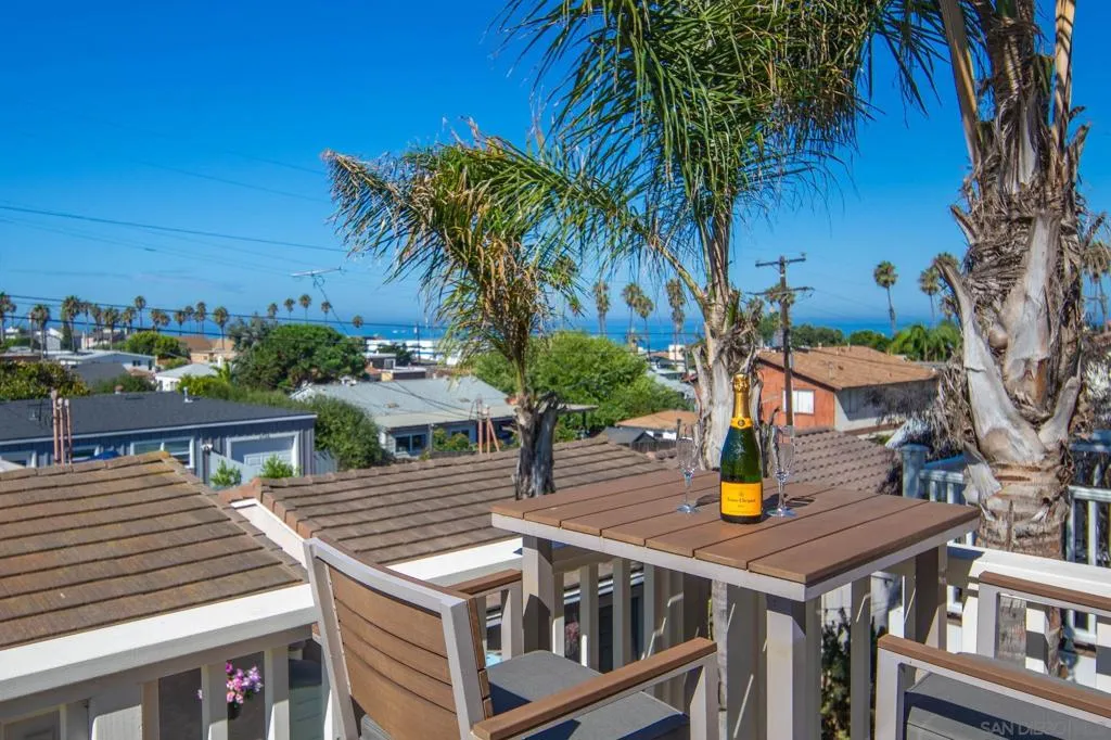 Rarely Available! Ocean Views | Steps to the beach | Built new 2001 | Casual indoor/outdoor coastal living. Pack your beach towels and begin your Sunset Cliffs dream life in this turnkey 3 bedroom 2.5 bath home. Built new from the ground up in 2001 and designed for modern, casual beach living. The flexible floor plan works beautifully for everyone to enjoy a comfortable beach life as a primary or second home, investment, or retirement. Low maintenance Mediterranean style stucco exterior w/long life tile roof. Plenty of closet and storage space. All dual pane windows, French doors and sliders with custom installed plantation shutters throughout. Central forced HVAC with brand new, high efficiency AC unit. Separate AC in primary suite for energy savings on warm summer evenings. A dream chefs kitchen featuring all GE Monogram appliances including double ovens, center island with range, and commercial grade refrigerator. Custom cabinetry and large walk in pantry provide plenty of counter and storage space. Recessed lighting throughout and conveniently located second story washer/dryer. Detached two car garage with built in overhead storage and epoxy coated flooring also has potential for ADU or second story addition. Three outdoor living areas add to the already spacious 1900 sq ft interior space. The front patio where you can watch the hummingbirds and butterflies play in the low maintenance/ low water use front yard. The backyard patio and ocean view balcony (expanded and completely rebuilt in 2020) provide more places to gather or watch the magnificent Sunset Cliffs sunsets! Only a block and 1/2 from the Bermuda Beach stairs and Sunset Cliffs. Easily walkable to the heart of Ocean Beach but just far enough away to enjoy quiet evenings. All day ocean breezes and easy access to everything OB and Point Loma has to offer. Scenic trails, weekly farmer’s market, Shelter Island, Liberty Station, Cabrillo National Monument, yacht clubs, the San Diego Bay, Humphreys outdoor concerts, etc etc etc! And with downtown, the airport, and Balboa Park only minutes away, you can truly have it all—without ever needing to get on a freeway! Please note: Some images were AI-generated and are noted as such; they are for illustration purposes only and do not reflect the actual property or its condition. We have additional renderings for your reference. The property itself is well maintained—you can move right in and begin creating your own story. Don’t wait—make your move today!