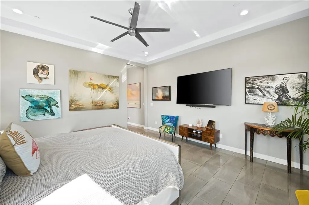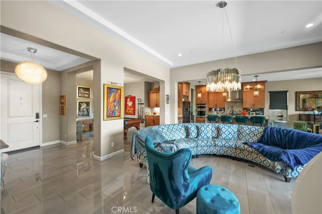 The gourmet kitchen is appointed with fully upgraded custom cabinetry, a waterfall-edge granite island, and premium stainless steel appliances—perfect for both everyday living and entertaining. An extended dining area provides additional space for gatherings, while the expansive great room features a designer fireplace, stylish expensive lighting, and seamless indoor-outdoor flow through sliding glass doors to the covered patio and landscaped backyard.
