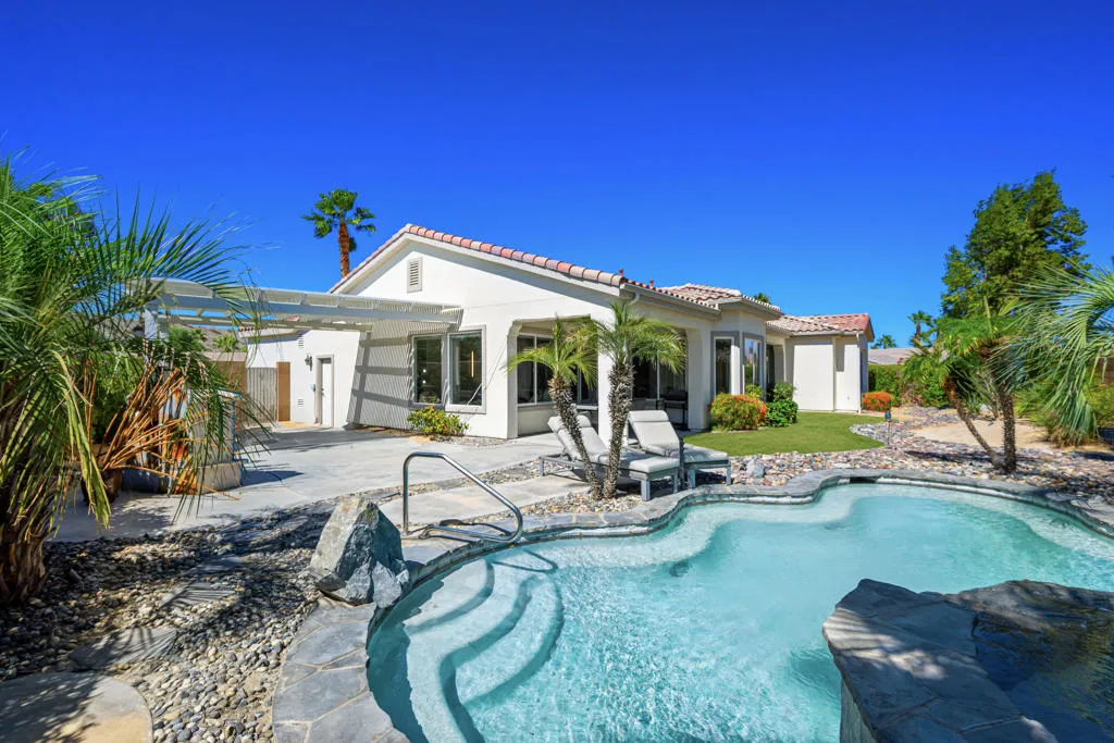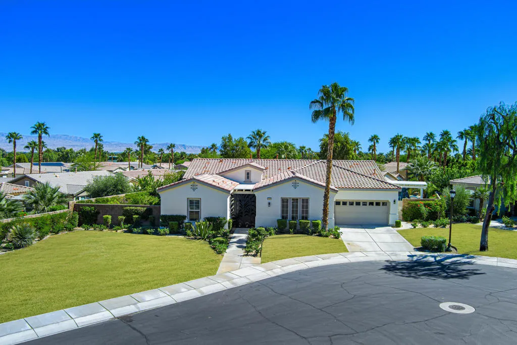 Experience the pinnacle of desert living in this rare Tamarisk model with detached casita, ideally situated on a private cul-de-sac within Trilogy La Quinta. Set on an expansive .35-acre homesite, this exceptional residence offers a beautifully landscaped front lawn, an inviting courtyard with ornate entry gate, three covered patios, an outdoor fireplace, and a resort-style pool and spa highlighted by a dramatic stone waterfall. Encompassing approximately 2,726 sq. ft. of refined single-level living, the home showcases 4 bedrooms, 4 bathrooms, a formal dining room with bay window, and a spacious great room with custom media niche. Recent upgrades include fresh interior and exterior paint (including the casita), new porcelain tile flooring with 7-inch baseboards, shutters, shades, and a custom-designed TV and electric fireplace wall. The gourmet kitchen is a true showpiece, boasting all-new cabinetry, quartz Gucci stone island, stainless steel sink, Monogram cooktop, built-in double ovens, designer accent walls and wall sconces, and a charming breakfast nook with custom bench seating and dry bar. The primary suite impresses with a tray ceiling, bay-window sitting area, walk-in closet, updated shutters, and a luxurious bathroom with separate shower. Additional enhancements include new toilets and faucets throughout, upgraded ceiling fans, custom built-ins, and a split 3-car garage. A rare offering of style, space, and upgrades, this home is not to be missed.