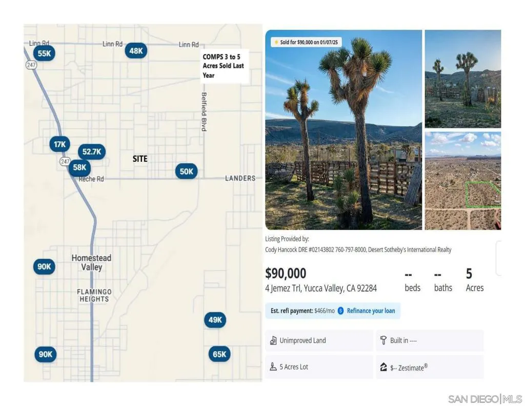4.5-Acre Corner Parcel with Active Paid Water Meter & Power in Landers, CA – Ready to Build. Discover the perfect opportunity to create your modern desert retreat on this 4.5-acre corner parcel in Landers, CA. With an active, paid-off water meter, electrical access (buyer to verify), and a completed boundary survey, this property is utility-ready and already ahead of the curve for your build. Located just off paved Reche Road and Sage Ave, this property combines easy access with wide-open views of the surrounding mountains and iconic desert landscape. Whether you envision a custom desert home, manufactured residence, tiny home, or horse property, this versatile lot is a true blank canvas. For those looking to accelerate the process, a collaboration with Nomad Micro Homes could bring a sleek 400 SF modern tiny home (SFR) to life in as little as 8–12 months—ideal for Airbnb, vacation rental, or a personal project. Renderings based on NOMAD Cube 3 architectural plans show the exciting potential. Enjoy the peaceful seclusion of high desert living while staying close to local attractions like Integratron, Giant Rock, Gubler Orchids, Sound Bath experiences, and the Morongo Basin Historical Museum, with Joshua Tree National Park and Yucca Valley shopping/dining just a short drive away. This rare property offers privacy, convenience, and investment potential in one of the desert’s most unique communities. Zoned RL (buyer to verify with San Bernardino County Planning Dept; APN: 0629-381-02 & 03) Seller is licensed real estate broker
