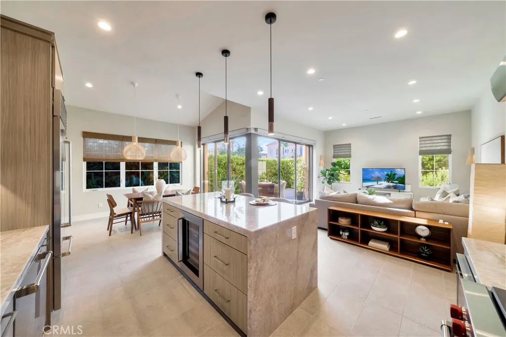 The bright, open-concept main level features soaring ceilings and dual stacked sliders that seamlessly connect indoor and outdoor spaces. The remodeled gourmet kitchen is a showstopper, boasting custom cabinetry, striking Quartzite countertops and backsplash, and a premium Sub-Zero/Wolf appliance package—including built-in refrigerator, six-burner stovetop, oven, microwave, wine cooler, and dishwasher. A spacious waterfall island with imported European pendants anchors the kitchen, perfect for entertaining. Adjacent, the dining area offers extended built-in storage, two natural wood-inspired pendant lights, and motorized Roman shades.