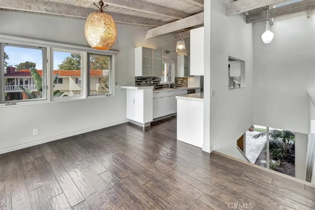 This beautifully remodeled single-level residence features 3 bedrooms and 2 bathrooms, designed for effortless coastal living. The bright and spacious living and dining areas are filled with natural light, anchored by a striking one-piece Italian marble fireplace. The chef’s kitchen is equipped with Thermador appliances, sleek countertops, and a wine fridge—perfect for entertaining. Skylights throughout the home bring warmth and openness, while walnut hardwood floors add timeless elegance.