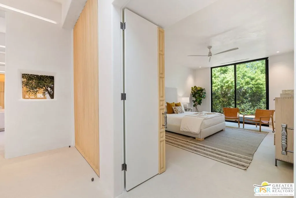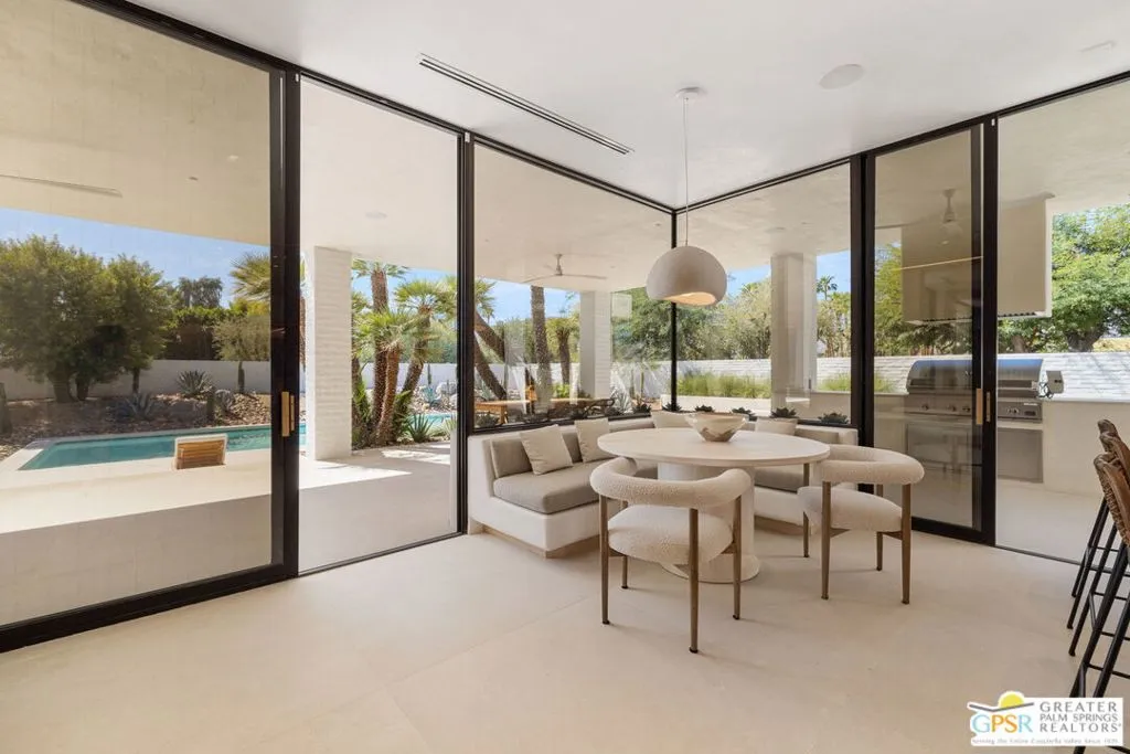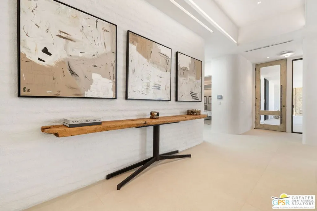 Dramatic contemporary at Tamarisk, Rancho Mirage. Designed by architects Holden & Johnson and reimagined by acclaimed designer Xorin Balbes, whose work Architectural Digest praised as “not just homes, but a whole philosophy for living.” Set on an elevated corner lot with expansive, unobstructed South and West mountain views that deliver the ultimate wow factor, this residence embodies the essence of desert resort living. Terraced pool and spa areas are framed by covered outdoor lounges, dining terraces, and desert modern landscaping where sculpted boulders, native plantings, and dramatic lighting complement the architecture and heighten its connection to the surrounding mountains. Inside, soaring ceilings and fluid entertaining spaces are anchored by a signature sunken bar and formal dining room. The modernist chef’s kitchen blends clean lines with glass-framed breakfast area and counter seating, featuring Sub-Zero refrigeration, Miele double ovens, Gaggenau dishwashers, and a built-in espresso station. Smooth plaster walls, fine stone surfaces, custom wood detailing, and new flooring add warmth and refinement throughout. Five ensuite bedrooms enjoy excellent separation, including a primary retreat with private gym or office. Nearly 5,200 square feet of sophisticated design with owned solar, Lutron lighting, full home automation, and a two-car garage plus golf cart parking. A timeless architectural compound adjacent to Tamarisk Country Club.