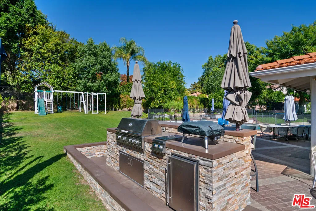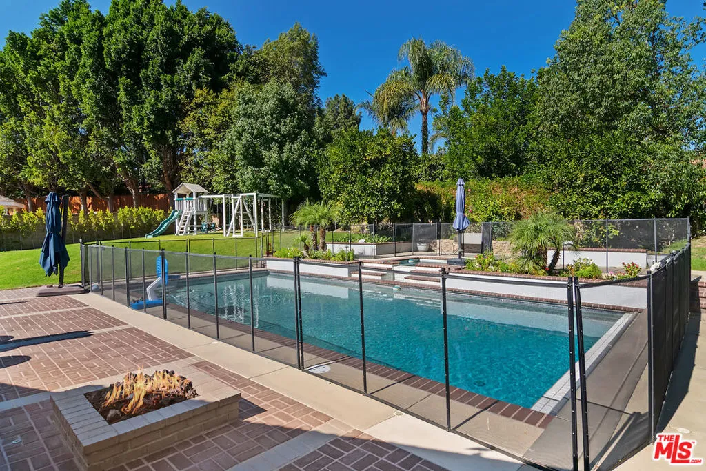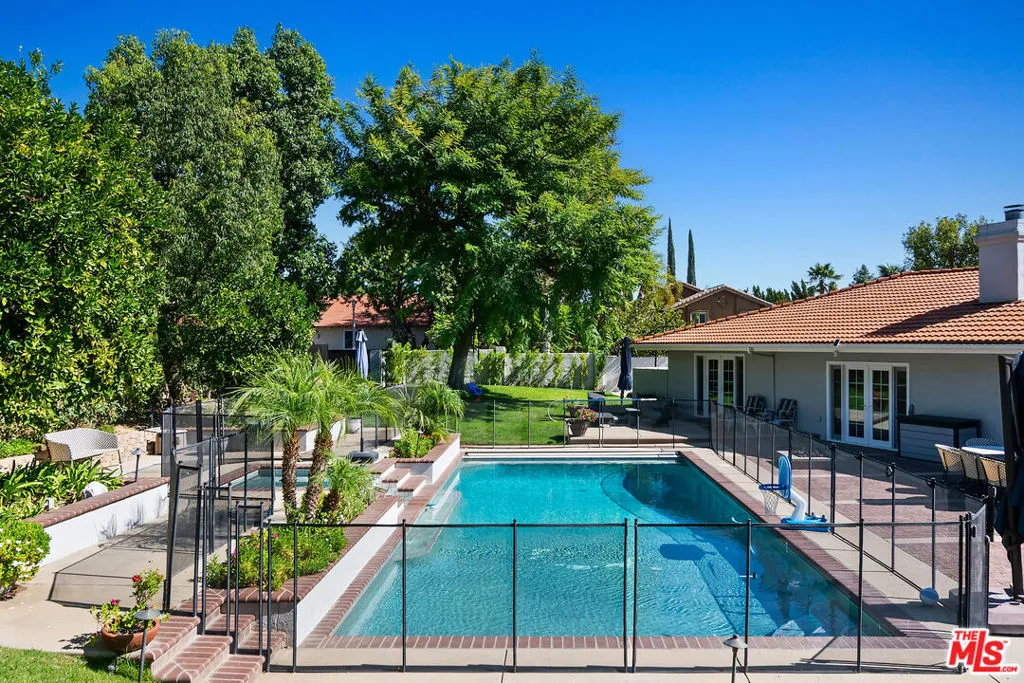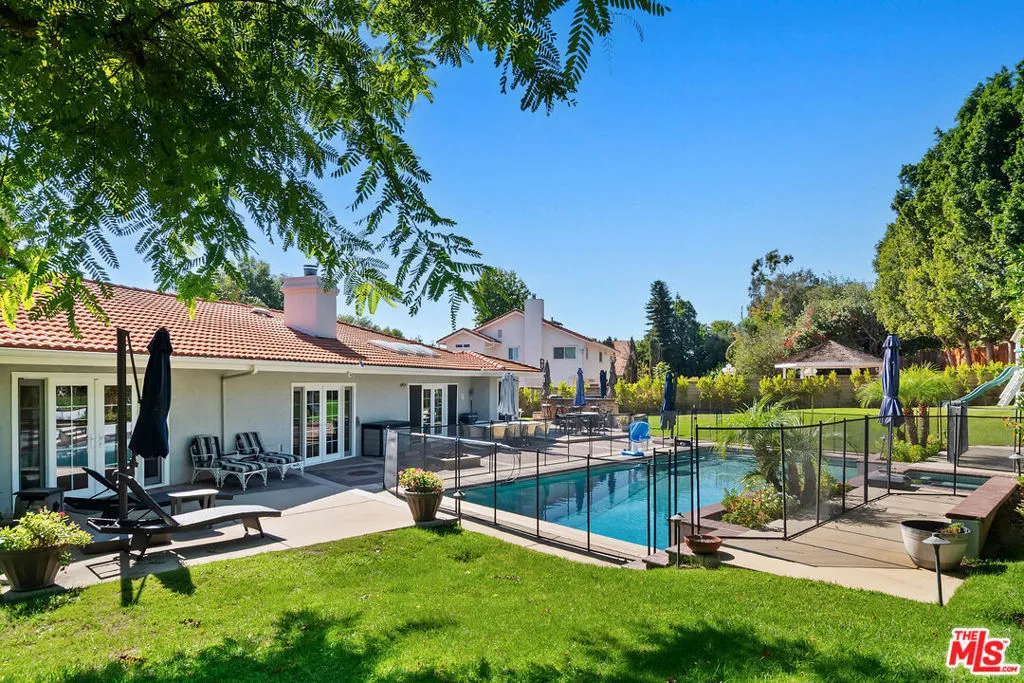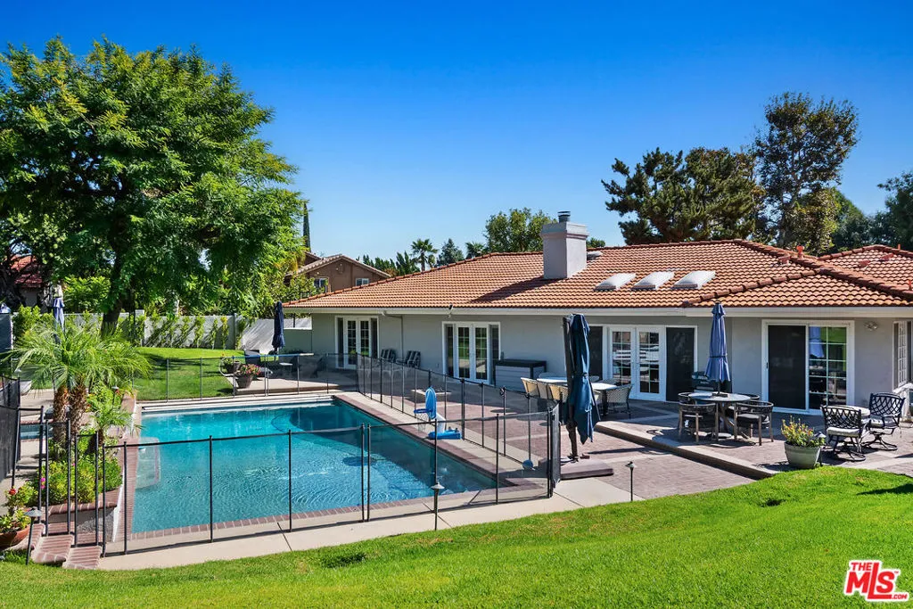 Welcome to this gorgeous single-story home on nearly half an acre, ideally situated on a corner lot in the highly sought-after Rancho de Caballeros community of Chatsworth. A true entertainer’s dream, this 5 bedroom residence offers an incredible backyard retreat complete with a sparkling pool, spa, outdoor kitchen, and sport court. Step through double doors into a spacious entryway with light oak wood floors throughout and soaring ceilings that create an open, airy feel. The living spaces include a formal living room, elegant dining room with custom built-ins, and a family room featuring a double-sided fireplace and custom cabinetry with a wine fridge. The primary suite is a serene sanctuary with newer Milgard French doors leading to the backyard and a brand-new designer bathroom boasting ceramic tile, a freestanding tub, frameless glass shower with brass fixtures, and a double vanity. Three additional bedrooms are located down the hall, along with a beautifully renovated bathroom. On the opposite side of the home, the kitchen offers stainless steel appliances and a cozy breakfast area. A spacious laundry room and guest suite with pool access complete this thoughtfully designed layout.Located just a short walk to the community tennis courts, this home also enjoys proximity to premiere private schools including Sierra Canyon and Chaminade. Commuting is easy with quick access to the 118 Freeway and Topanga Canyon. The neighborhood is enriched by scenic open-space amenities explore the Santa Susana Pass State Historic Park, Chatsworth Trails Park, Stoney Point, Chatsworth Oaks Park, and nearby equestrian and hiking areas. This rare gem in Rancho de Caballeros delivers the lifestyle, location, and luxury you’ve been waiting for.