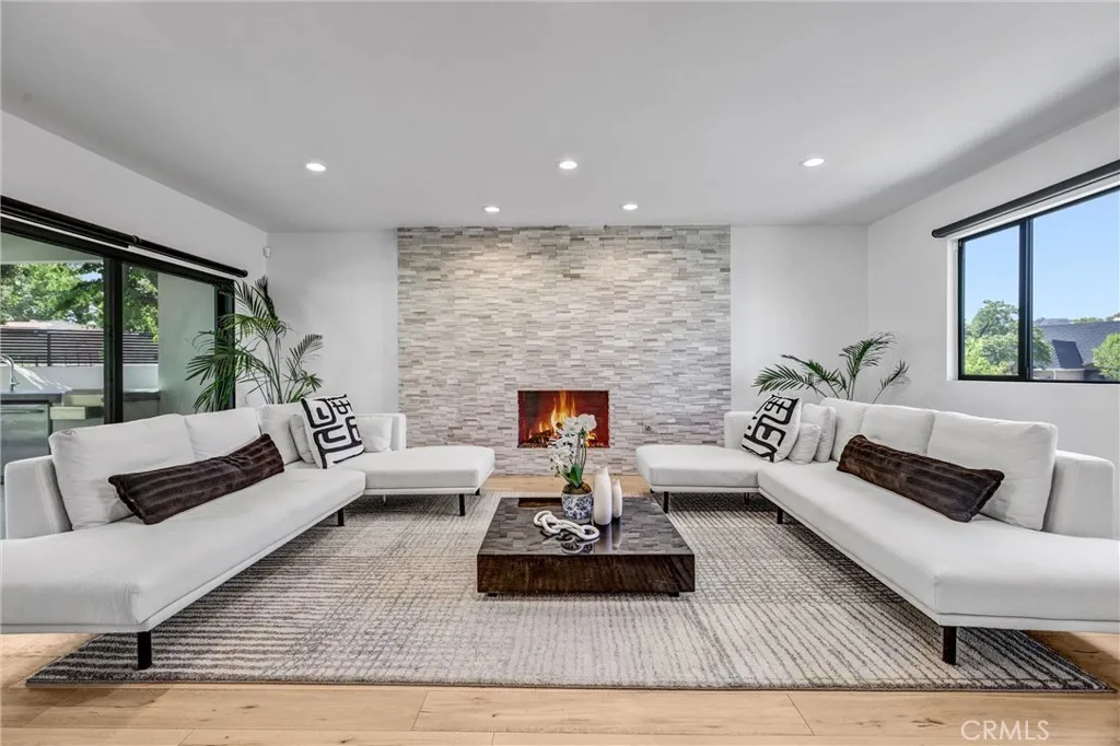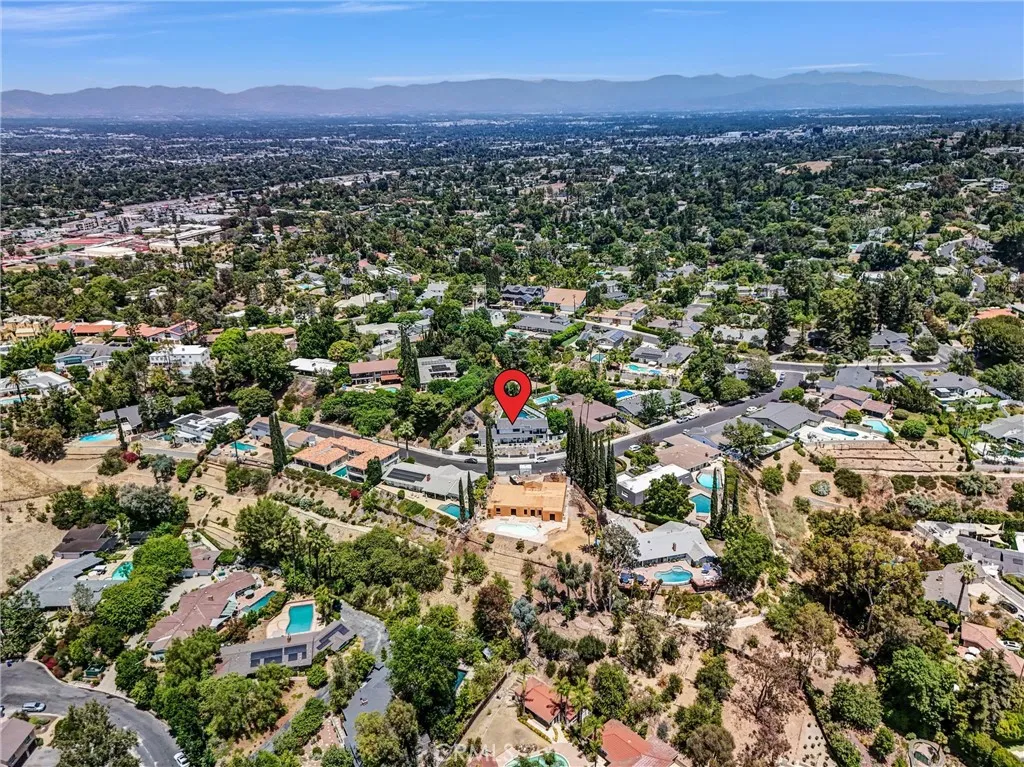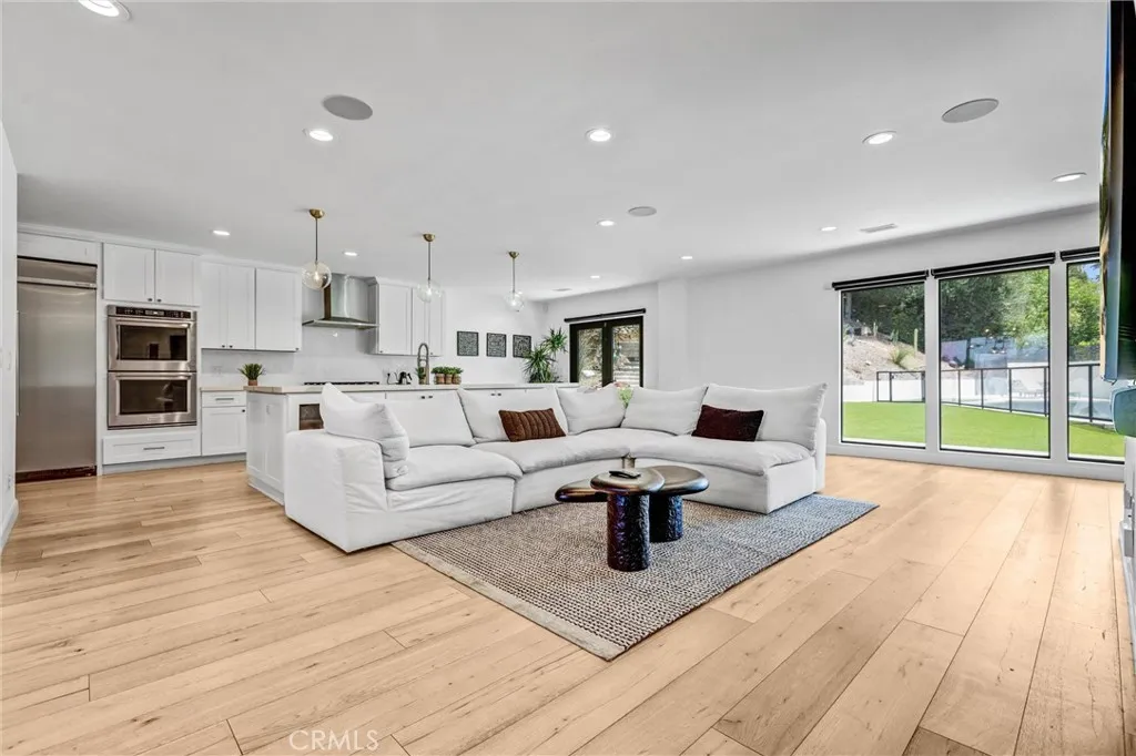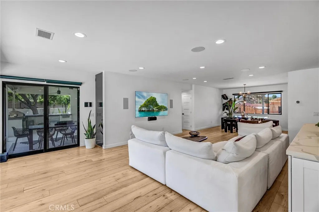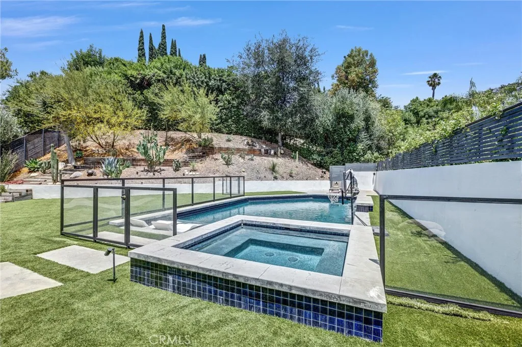 Nestled behind a gated entrance in one of Woodland Hills’ most sought-after neighborhoods, south of the boulevard, this entertainer’s dream seamlessly blends elegant design with state-of-the-art convenience. Inside, distressed white oak floors flow through a bright foyer entered via a custom glass front door, leading to a living room warmed by a striking stone fireplace. The chef’s kitchen delights with crisp white cabinetry, quartz countertops, a generous island, and a large walk-in pantry—all designed to enhance both daily living and entertaining. Through the kitchen and living spaces, bi-folding glass doors open to a resort-style backyard featuring a black-bottom pool with spa, a terraced hillside walkway, integrated sound system, covered outdoor kitchen, and cozy gas fire pit—perfect for indoor-outdoor gatherings. The home is fully automated with a Control4 smart-home system for lighting, climate, audio, and security, satisfying the expectations of today’s tech-savvy buyer. This is refined, modern living in the heart of Woodland Hills.