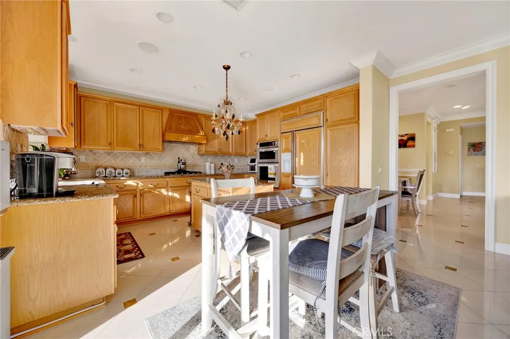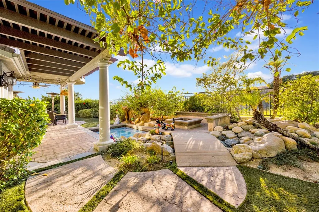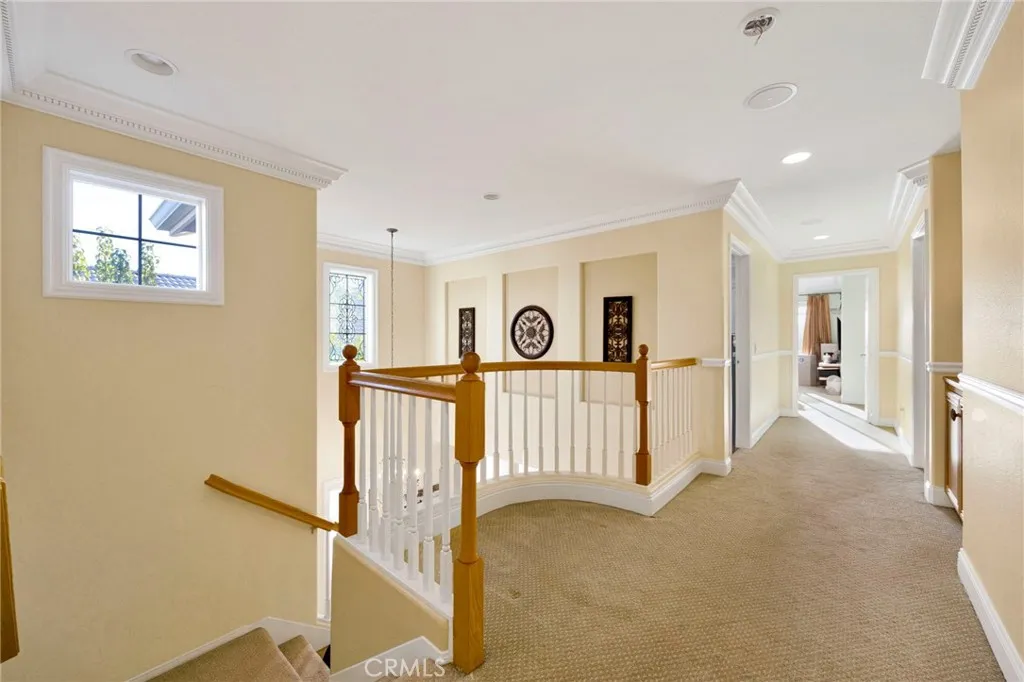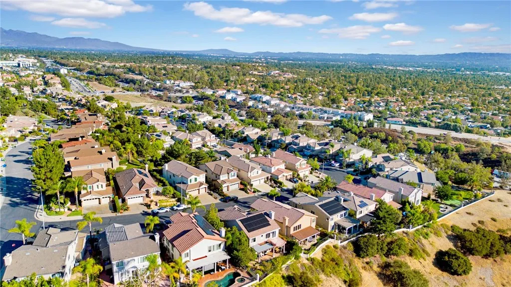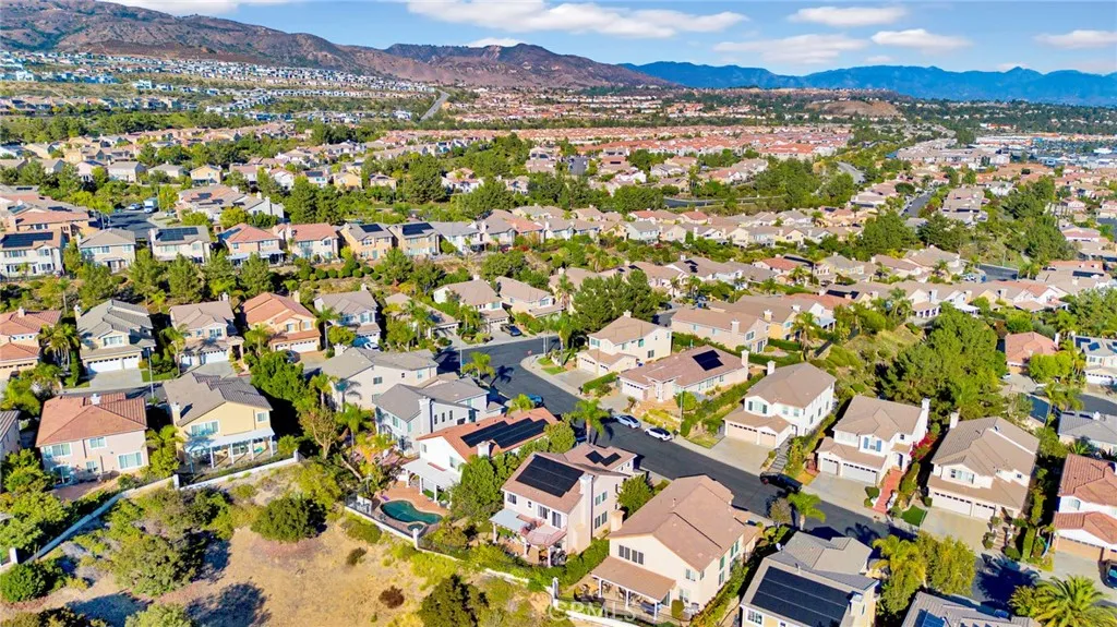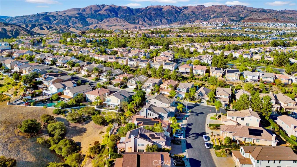 Unrivaled Views – Sorrento Living at Its Finest. DO THE COMPARISON! Unmatched value in the exclusive, guard-gated Sorrento community of Porter Ranch with sweeping city views. Elegant two story home, manicured landscaping and a serene sunset backdrop. 2,709 square feet of elegant & bright living space featuring striking curved staircase with wooden banister. The two story foyer highlights the beautiful chandelier and tiled flooring with decorative inlays. The walls are painted a warm, light yellow, complemented by custom white crown moldings. Adjacent to the living room is the dining section and a family room that seamlessly flows into a gourmet kitchen with granite counter tops, light wood cabinetry, large center island, custom backsplash and built in appliances like fridge, stainless steel double oven, cooktop, and dishwasher. Abundance of windows plus sliding door leads to the backyard from the family room to a resort backyard + paved patio area under a pergola supported by columns. An inviting spa among decorative rocks and unbelievable sunsets! First floor includes 1 bedroom, 1 full bathroom and a separate room for laundry adjacent to a direct access three car garage. Ascend to the second floor and you will find 5 bedrooms and 2 bathrooms. Spacious second floor landing is bathed in natural light from well placed high custom windows, natural toned carpet and expansive transition to the bedrooms and the private primary suite. 3 spacious bedrooms and a primary bedroom. The primary suite is the highlight of this home, the major highlight is the direct access to the private terrace with views of the hills and city. Views all the way to Santa Monica mountains, Santa Susana mountain, and the entire the valley. The primary en suite bathroom features tiled walk in shower and deep soaking tub with a perfect window placement to absorb in all the views. The dual sink vanity with ample counter space highlighted by two ornate, matching mirrors and stylish sconce lighting. Also not to forget the generous walk in closet ensuring a high end primary suite experience.