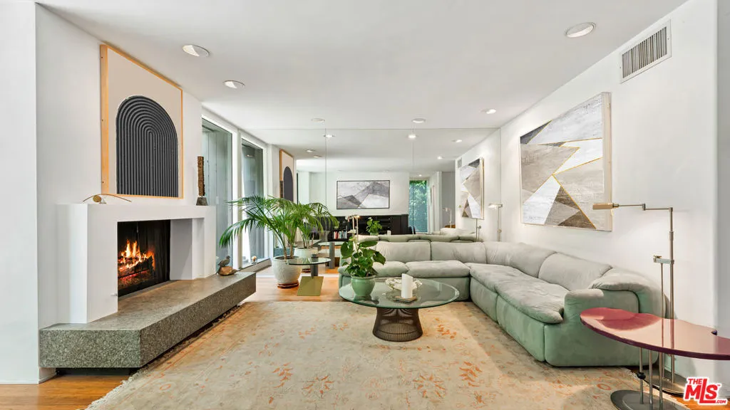 Located in a prestigious enclave, this sophisticated coastal condo offers refined living with every modern convenience. A private community pool and exterior camera system provide peace of mind and an elevated lifestyle. The entry welcomes you with stone tile floors and a mirrored accent wall, setting a polished tone. Ascend the stairs to the main living floor where curated details and natural textures define the space.The powder room features stone counters, a modern sink, and a sleek vanity. Just ahead, the living room boasts warm wood floors, a fireplace with a stone hearth, recessed lighting, and sliding glass doors that open to a private patio. Ideal for seamless entertaining, the adjacent dining area features additional built-ins and a stone sideboard. A nearby wet bar includes granite counters, a sink, wine storage racks, and ample cabinetry, perfect for hosting.The chef’s kitchen is thoughtfully appointed with granite counters, a four-burner range, Gaggenau oven and hood fan, Miele dishwasher, and Liebherr fridge and freezer. A sliding glass door opens to a tranquil seating area with a fountain, enhancing the indoor-outdoor flow. The Nest smart thermostat system adds intuitive climate control throughout.Upstairs, the first landing offers convenient built-in storage. The expansive primary suite impresses with carpeted floors, soaring wood-beamed ceilings, a fireplace, and a large sitting area with built-in shelving and a TV. A secondary closet includes a built-in bar and mini fridge, while the large wardrobe features custom built-ins. The primary bath includes a high skylit ceiling, stone details, a spacious shower stall, and a refined vanity with built-in storage.A secondary bedroom also includes closet space with mirrored doors, built-in drawers and shelves, and a sliding wood door leading to a luxurious en-suite bathroom with stone counters, a makeup vanity, and a shower over tub.The private patio extends the home’s appeal with stone tile floors, a partial cover, a built-in music system, an outdoor fireplace, storage, and a charming fountain. Additional amenities include central air and heat, a mudroom/laundry area with stacked Miele units, and a two-car garage with ample storage. This condo is a true turnkey sanctuary in a coveted coastal setting.