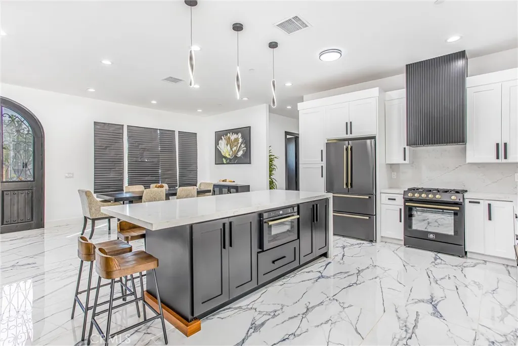 The gourmet kitchen is the heart of the home, anchored by a massive waterfall island in quartz, a full solid-quartz backsplash, and an abundance of custom soft-close cabinetry. A spacious pantry provides ample storage, while all appliances—from the built-in microwave to the premium suite—are thoughtfully included.