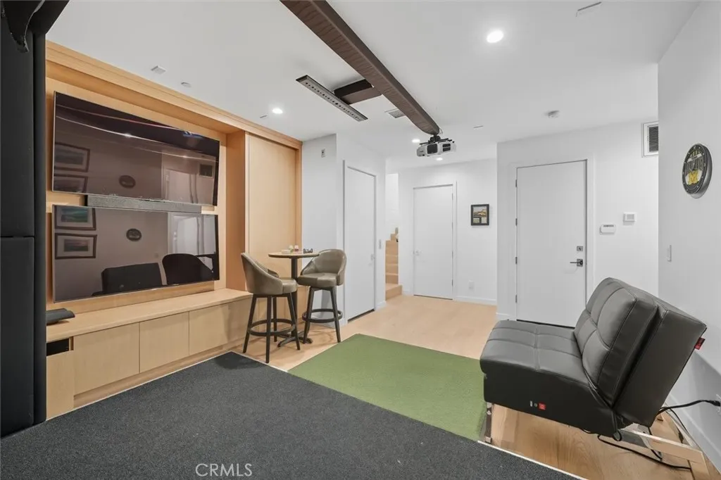 From the main living space, stairs lead to a rooftop deck with sweeping, unobstructed views of the PV hill, the ocean and city lights—an ideal spot to take in the sunset. A spacious beach level room is currently fitted with a high-end golf simulator, creating a versatile space for entertainment and leisure.