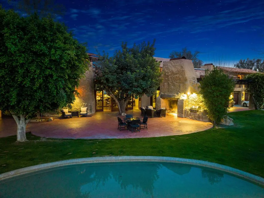 Welcome to The Adobe Hacienda, a private 1.5-acre gated estate in the heart of Rancho Mirage, offering unmatched character, artistry, tranquility, and the rare potential to be configured as an intimate equestrian-style retreat. This expansive property also offers an appealing opportunity for the noncommercial keeping of horses, goats, and smaller livestock, subject to city and county regulations. Designed by renowned architect Jim McIntosh, this 8,990 sq ft custom-built compound features 2 spacious bedrooms, a library, a grand kitchen, multiple living areas, 2 dining areas, and 3.5 bathrooms in the main home. Three detached casitas/studios–each with its own living quarters–create ideal spaces for guests, artists, staff, or a private retreat. A massive tandem-style garage accommodating over six cars makes this a car lover’s dream. Crafted with 2-foot-thick rammed-earth walls and floors stained with red wine pigment, the estate blends strength and sustainability with beauty. Imported details include stained glass from Amsterdam, hand-forged ironwork from London’s Barclays Bank, and sinks and doors from England’s Cotswolds. A powder room ceiling of peacock feathers and hand-painted details throughout adds whimsy and soul. Lush courtyards, romantic balconies, a saltwater lagoon-style pool, a bird aviary, and custom storybook-inspired garden walls invite outdoor living, all framed by panoramic mountain views.
