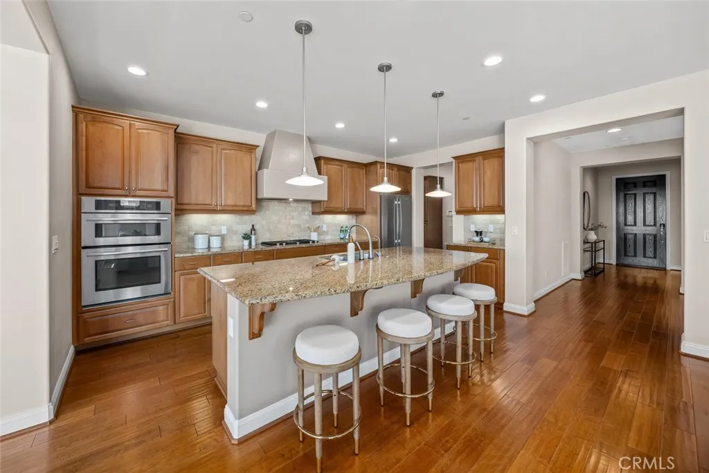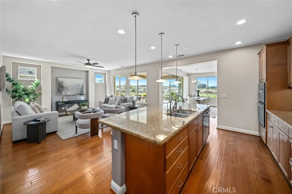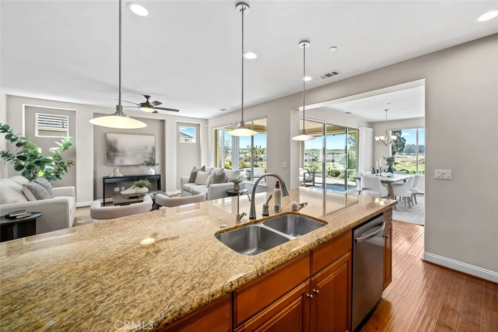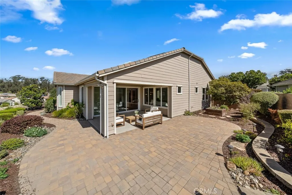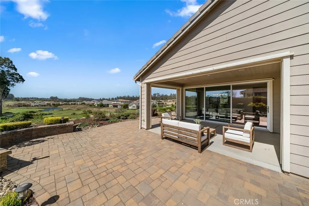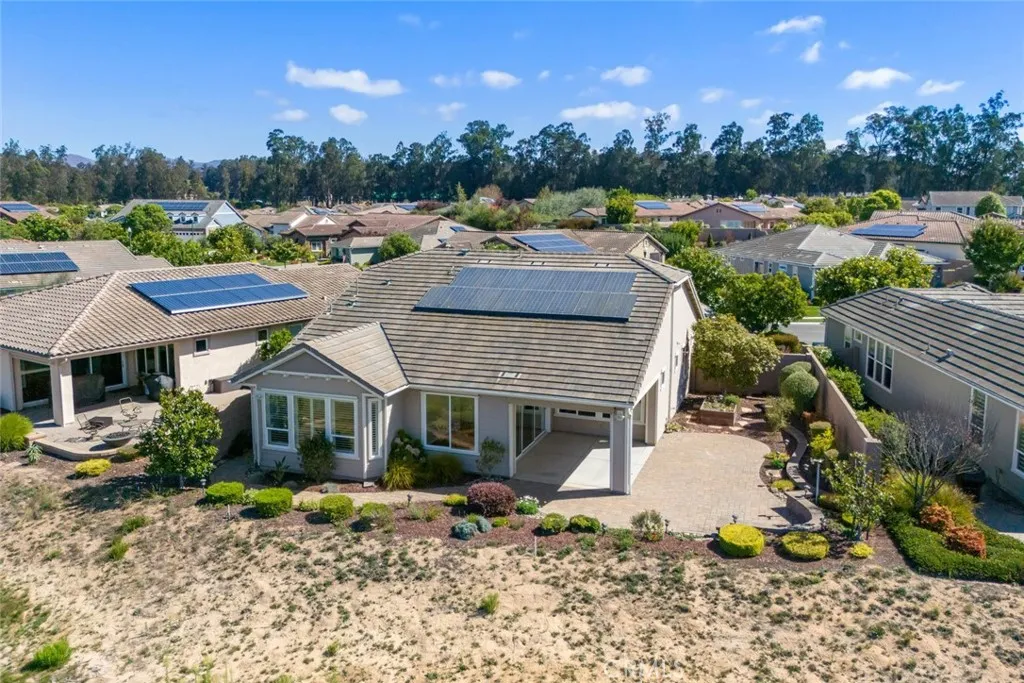Resort living begins in this California Coastal “Nice” floor-plan home, beautifully situated on a very desirable cul-de-sac with a birds-eye panoramic view of the 5th, 6th and 7th holes of the Challenge Golf Course, plus the magnificent coastal sunsets. This 1,945 sq. ft. home, built in 2014, offers 2 bedrooms, 2 full bathrooms, plus a den with French door enclosure. Designer upgrades abound, including gorgeous hand scraped engineered wood floors, sweeping granite island with custom lighting, plantation shutters, ceiling fans and a rolling wall of glass providing exquisite views. Enter the gallery hallway and head toward the culinary kitchen – you’ll love the raised panel cabinetry, granite countertops and island, tile backsplash, JennAir stainless steel appliances, including a 5-burner cooktop and a walk-in pantry – it’s a chefs dream! Around the corner is the coveted SmartSpace/laundry, designed for optimum organization with a built-in desk, storage cabinets and countertops – it’s a great space for working from home or enjoying your favorite hobbies. Across from the kitchen is a super comfortable living room with a spacious den next door, and a large dining room with loads of natural light and incredible views. Head outside the rolling wall of glass to the covered patio – it’s the perfect spot to relax and enjoy the incredible central coast sunsets. The patio is surrounded by gorgeous, lush landscaping which frames the breathtaking golf course and lake views, and features plenty of hardscape space to entertain family and friends. Meandering pathways lead to the side yards, one outfitted with a raised garden bed. When it’s time to head indoors you can retire to your luxurious owner’s suite with a spacious bedroom which overlooks the backyard, and an en-suite bathroom with separate dual sinks, tile shower with seamless glass enclosure, and a large walk-in closet. Your guests will enjoy the comfort of their own wing with a light and airy bedroom and a full bath with tub/shower. In addition, there’s energy-efficient solar and a 2-car garage. Best of all, this spectacular home is located in Trilogy with all the amenities to fully enjoy life on the Central Coast.