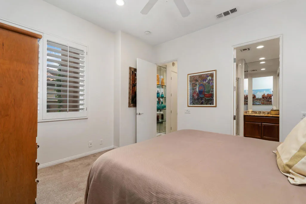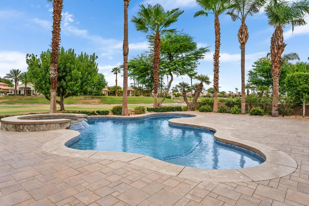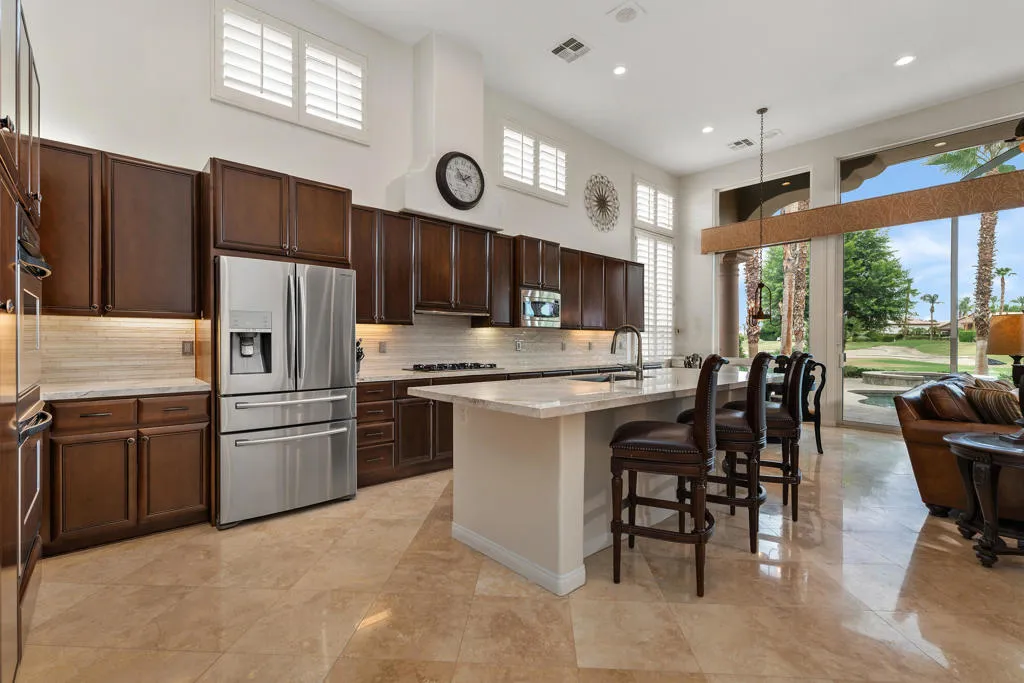 Your ultimate Desert retreat awaits with this exceptional Encanto II estate at Rancho La Quinta Country Club, offering 4 bedrooms and 3.5 bathrooms, including a private, detached two-bedroom casita. Step into refined desert living with travertine flooring throughout the main spaces and baths, complemented by newer bedroom carpeting. The gourmet kitchen features stunning quartzite counters, a custom glass tile backsplash, and stainless appliances–a perfect canvas for the discerning chef. The outdoor sanctuary is designed for grand entertaining around the shimmering free-form pool on an expansive patio. Enjoy spectacular, uninterrupted golf and lake views down the 14th hole of the renovated Jones course, framed by the dramatic Chocolate Mountain Range–indoor-outdoor living perfected. Rancho La Quinta Country Club offers a world-class environment. A Sports Membership is included with HOA dues, granting immediate access to the vibrant tennis and pickleball facility, pool complex, fitness center and the highly anticipated renovated clubhouse slated for completion mid-season. This is a rare, turnkey opportunity to acquire a premium, low-maintenance luxury lifestyle.