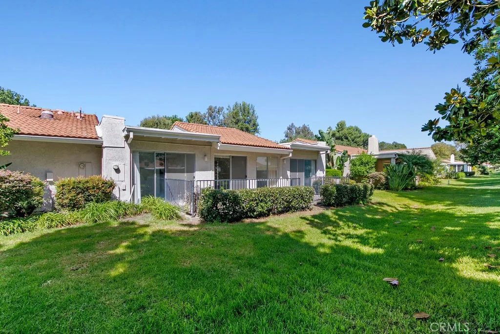 Opportunity awaits you to own a Francesca Model home in the active senior community of Laguna Woods. This single story end unit is located on a gorgeous, wide greenbelt. Enter the gated patio to the 2 bedroom, 2 bathrooms plus den of approx. 1643 sq feet. The wood vinyl entry features an open floor plan. It has a large living room with vaulted ceiling and full wall dual sliding doors to the gated patio and beautifully landscaped wide greenbelt. The dining area is open to the living room, kitchen, and the large bonus room. With the multiple windows for the light and airy feel, and the built in storage credenza, it can be a family room, office, or library. Don’t miss the mirrored wet bar for entertaining your family and friends. The kitchen is efficient with multiple cabinets, built in appliances, electric stove, dishwasher and refrigerator. It has direct access to the one car garage with additional storage on both sides. One bedroom suite has a corner jet tub, newer vanity with a contemporary glass sink and walk in closet. The other bedroom has an adjoining bathroom with full size walk in shower and another walk in closet. This bathroom also has access from the hallway. Both bedrooms have large sliding doors to the patio. Imagine having your morning coffee or relaxing in the late afternoon or evening next to the peaceful landscaped greenbelt. There are multiple skylights, ceiling fans in every room, well maintained HVAC, and water heater. The washer and dryer are included. The Laguna Woods Community features golf, tennis and pickleball, swimming, fitness clubs, and approximately 200 clubs, social events, a performing arts center and activities. Laguna Beach, shopping, health centers and multiple gate guarded entries make Laguna Woods a lifestyle you don’t want to miss.