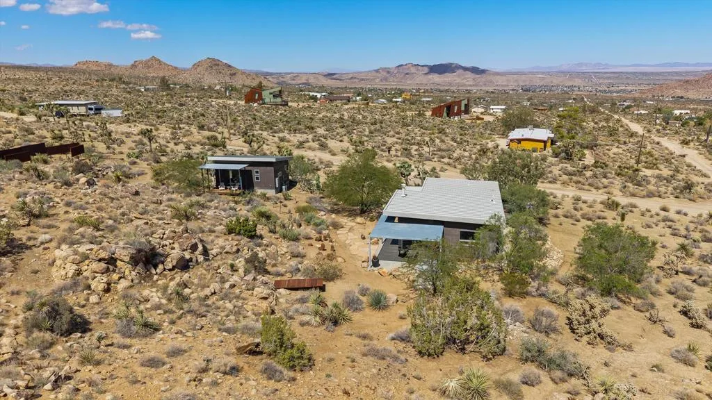 Nestled in the prestigious neighborhood of Joshua Tree Highlands, a unique opportunity to own a 2+ acre compound boasting two modern homes awaits. The main home was built in 2010, and the guest house followed shortly after in 2014, both by famed local builder David Eckenroth. Peace and tranquility, just minutes from the National Park’s west entrance gate. The main house is a blank canvas ready to be transformed into your dream retreat. With an open-concept layout, sleek concrete floors, lofty ceilings, and outdoor shower, the space awaits your design direction and showcases panoramic views in every direction. The guest home offers privacy and versatility, with its own deck showcasing awe-inspiring views and outdoor bathing under the stars. Inside, custom cabinetry and polished concrete floors echo the main house’s contemporary footprint. This space serves as an ideal guest suite, art studio, or office, just waiting for the finishing touches to be added. Immerse yourself in the quiet and serene ambiance of Joshua Tree, with expert planting of intentional and curated desert vegetation, iconic desert topography including boulders and Joshua trees. This compound is a true escape, offering endless potential for investors, artists, or anyone seeking a modern sanctuary in the desert.