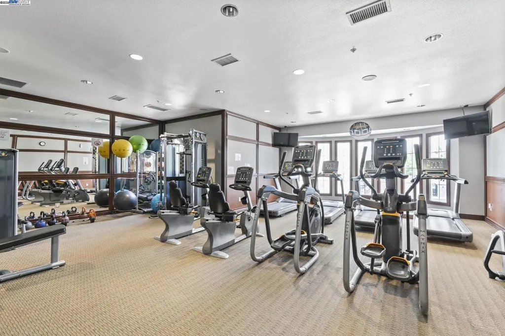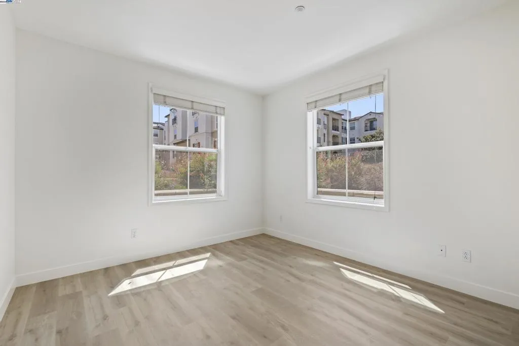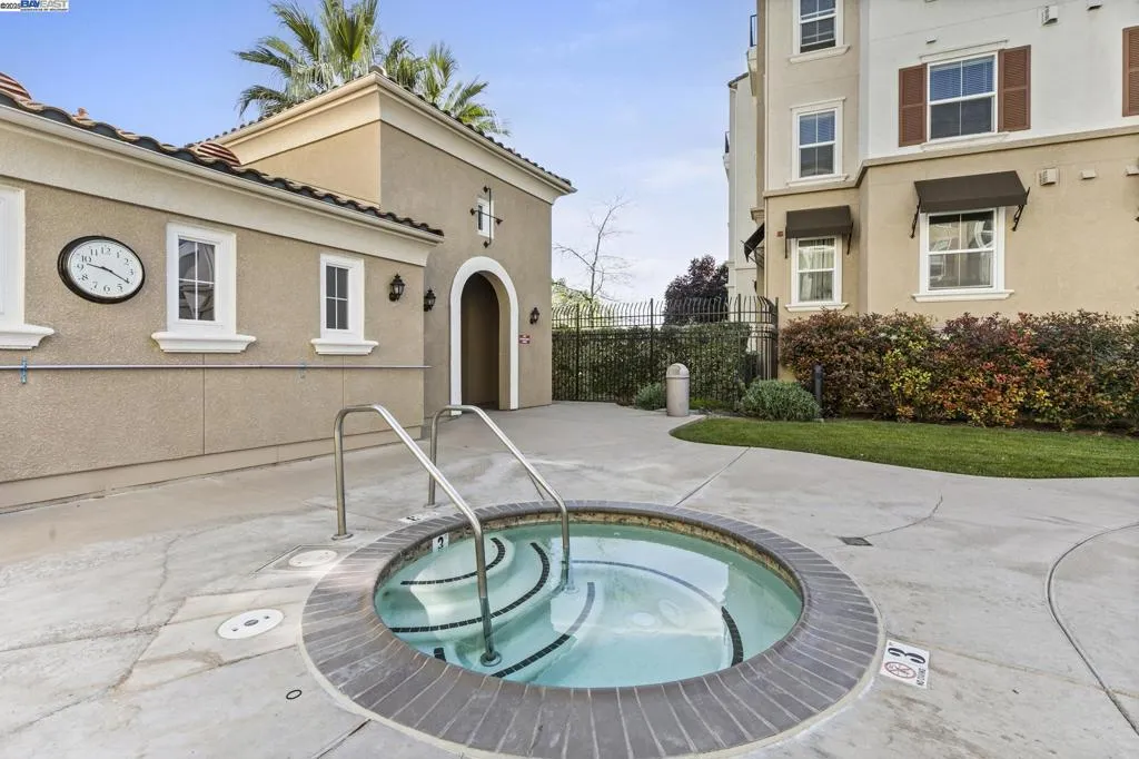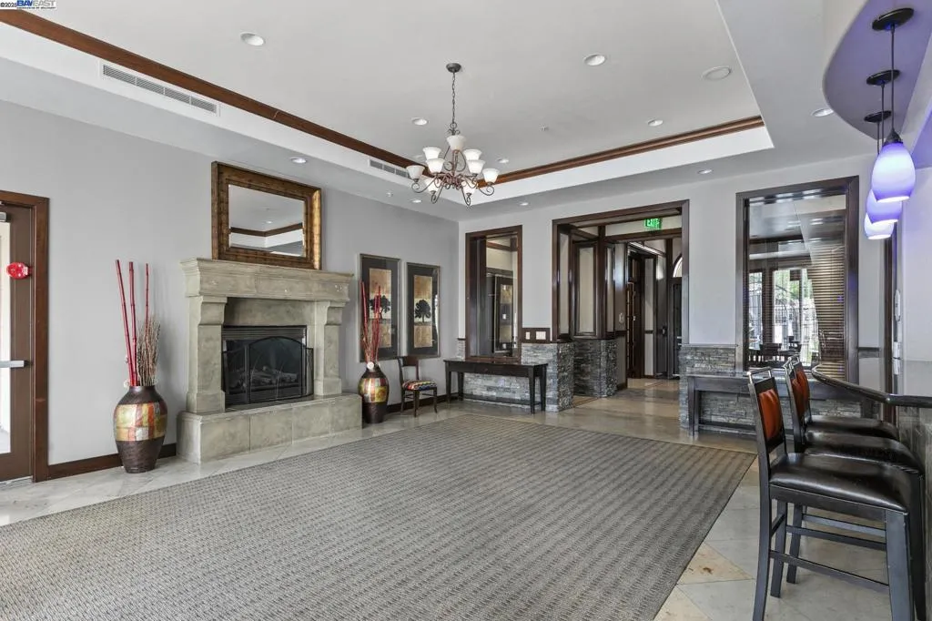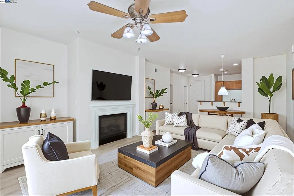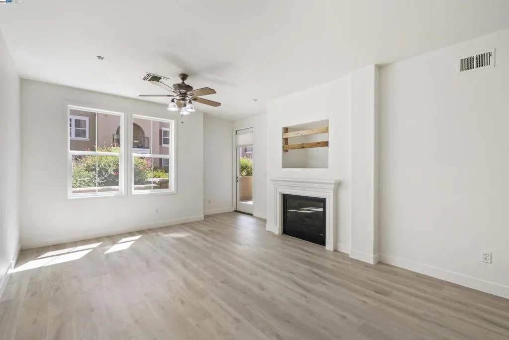 Desirable single level corner end-unit on the first floor offers a lifestyle of luxury and convenience. Large private patio perfect for entertaining and relaxation seamlessly transitions to the serene courtyard, creating a lovely indoor-outdoor living experience. 9-feet ceiling, natural light and open layout great room creates an airy and modern atmosphere. New paint and beautiful LVP flooring throughout the entire unit. Kitchen offers granite counters, maple cabinets, eat-in breakfast bar. Primary bedroom includes a walk-in closet and ensuite bathroom with a double vanity and walk-in shower. The third bedroom provides a versatile space for a home office, gym, creative studio, guest room or playroom. Central AC and heating system and ceiling fans. Washer/dryer in hallway closet. Resort style amenities include a clubhouse with gourmet kitchen, state-of-the-art gym and heated pool and spa. 24-hour secured gate entry. Assigned 2 side-by-side parking spaces in the secured underground parking lot with guest parking spaces and elevator access. Prime location near top rated schools, shopping, restaurants, golf, Kaiser, BART and 580/680. Walk to the new Emerald High School, Bray Commons Park with a fenced dog park, playground, basketball court. Please note 4 photos are virtually staged.