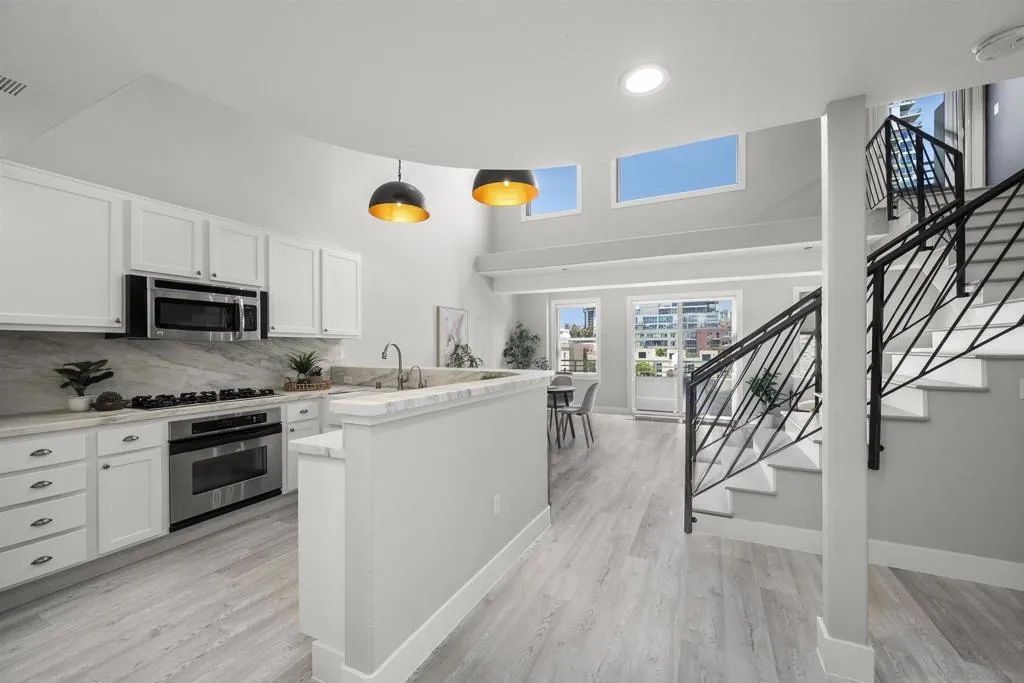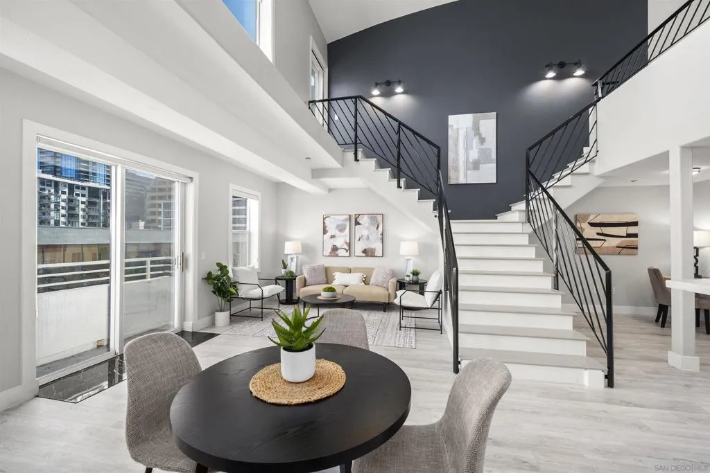 PRICE IMPROVEMENT! TOP-FLOOR, CORNER UNIT, 2-STORY LOFT w/SPLIT GRAND STAIRCASE! Immerse yourself in the lively culture of LITTLE ITALY with its renowned restaurants, bars, and cafes like Born & Raised, Craft & Commerce, and the vibrant Piazza Della Famiglia. Enjoy proximity to the San Diego Bay, Waterfront Park, and the Farmer’s Market, all within 3 blocks! This one-of-a-kind unit offers 1,055 square feet of modern living with an open loft-style bedroom and 2 full bathrooms. As you step inside, you’ll be greeted by towering 20-foot ceilings and brand new luxury vinyl flooring. This fully remodeled kitchen features elegant marble counters with a wraparound bar, perfect for hosting and entertaining. Enjoy the convenience of an In-Unit Full Size Washer/Dryer, and unwind on one of the two oversized private balconies. This loft-style penthouse is thoughtfully designed with a double staircase adorned with custom wrought iron railings, providing an artistic touch to the space. The upstairs area offers a full bath, loft style bedroom, Walk-In Closet, Balcony, and automatic blinds. Downstairs offers 1 full bath and a flex-space to be used as an optional bedroom, den, or office. 1 assigned, oversized, underground parking spot, that includes storage and additional space options (see pics). Village Walk amenities include a beautiful common courtyard with a waterfall, large fitness center, and a community rec room for social gatherings. This top-floor gem offers the ultimate blend of comfort, luxury, and urban convenience. Make it yours today!