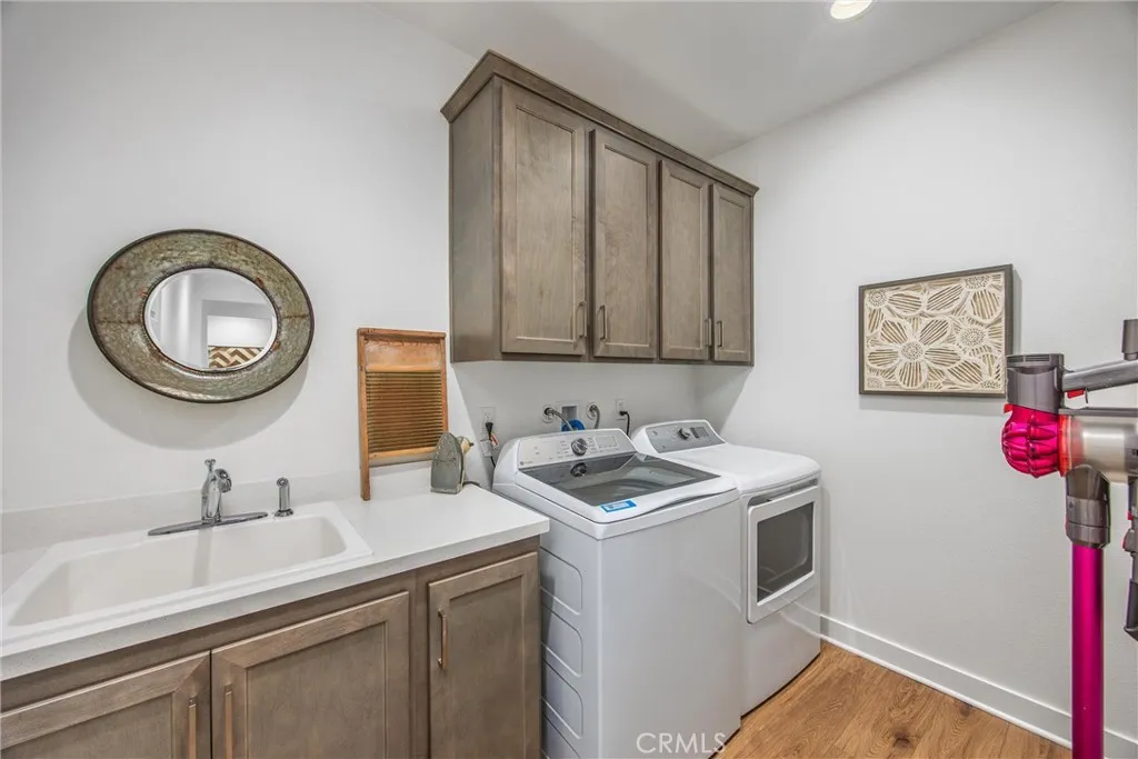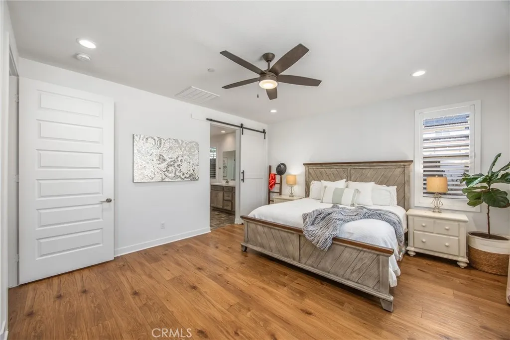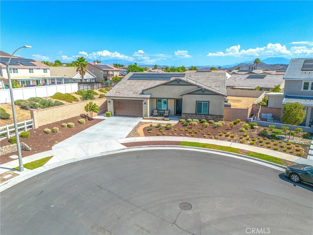 A stunning single-story Savannah model by Tri Pointe Homes, nestled in the sought-after Compass neighborhood of Audie Murphy Ranch in Menifee. This beautifully designed ranch-style home offers 2,800 sq. ft. of living space on an expansive 10,000+ sq. ft. lot, perfectly positioned at the end of a quiet cul-de-sac with breathtaking mountain views. From the moment you arrive, you’ll be impressed by the extra-long driveway, owned solar, drought-tolerant landscaping, and a charming front porch that sets the tone for this exceptional property. Step inside to soaring ceilings, 8’ doors, tall baseboards, recessed lighting, plantation shutters with bright natural lighting through out. Off the entry is a versatile flex room ideal for an office or easily converted to a 5th bedroom. Down the hall are three spacious secondary bedrooms, two with walk-in closets and one with mirrored wardrobe doors, all pre-wired with media packages. They share a stylish bath with dual sinks, quartz countertops, and a tub/shower combo. The heart of the home is the massive Great Room! The adjoining dining area and gourmet kitchen offer everything for the modern entertainer: a grand island with custom wood paneling, granite counters, soft-close cabinetry, double ovens, convection microwave, gas cooktop with pot filler, stainless steel hood, and walk-in plus butler’s pantry.