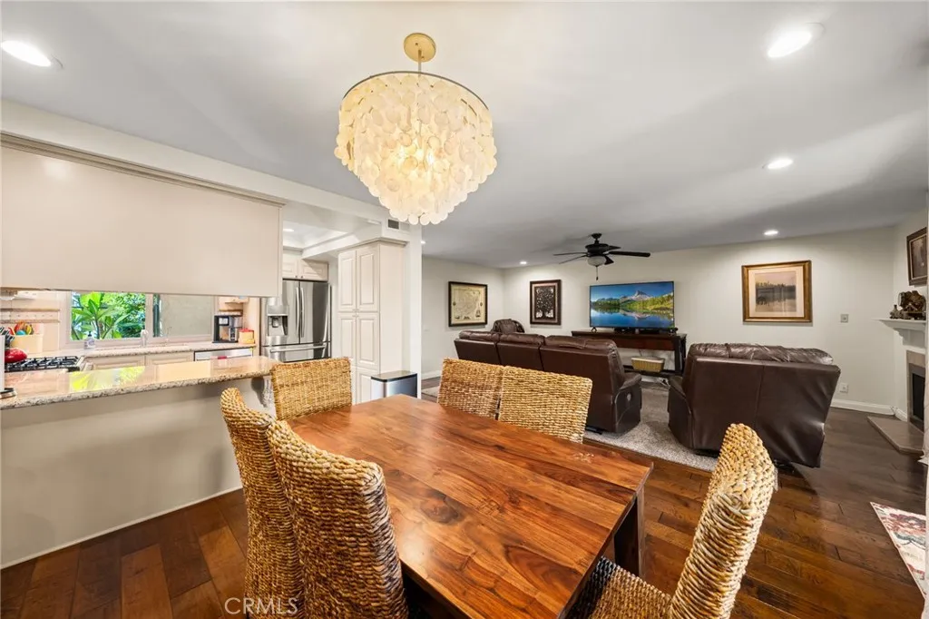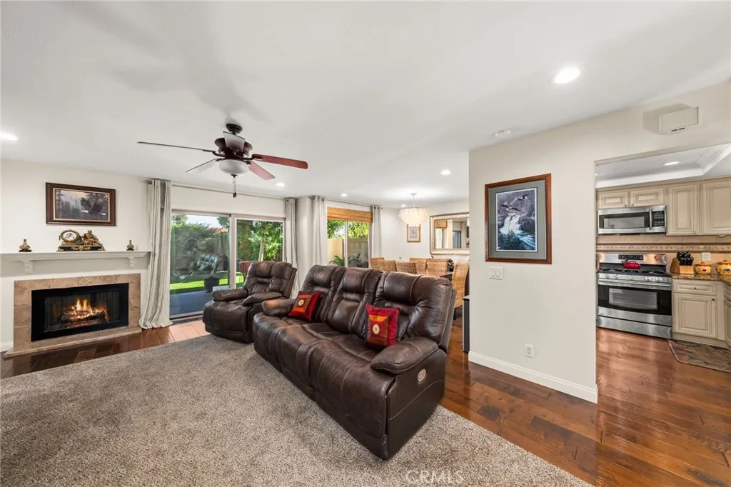 Adjacent to the kitchen, the dining room boasts a custom chandelier, recessed lighting, and a large window overlooking gorgeous rear yard and entertaining patio. This space flows seamlessly into the living area with a cozy fireplace, recessed lighting, custom removable carpet, and a sliding glass door with a built-in glass doggie door.