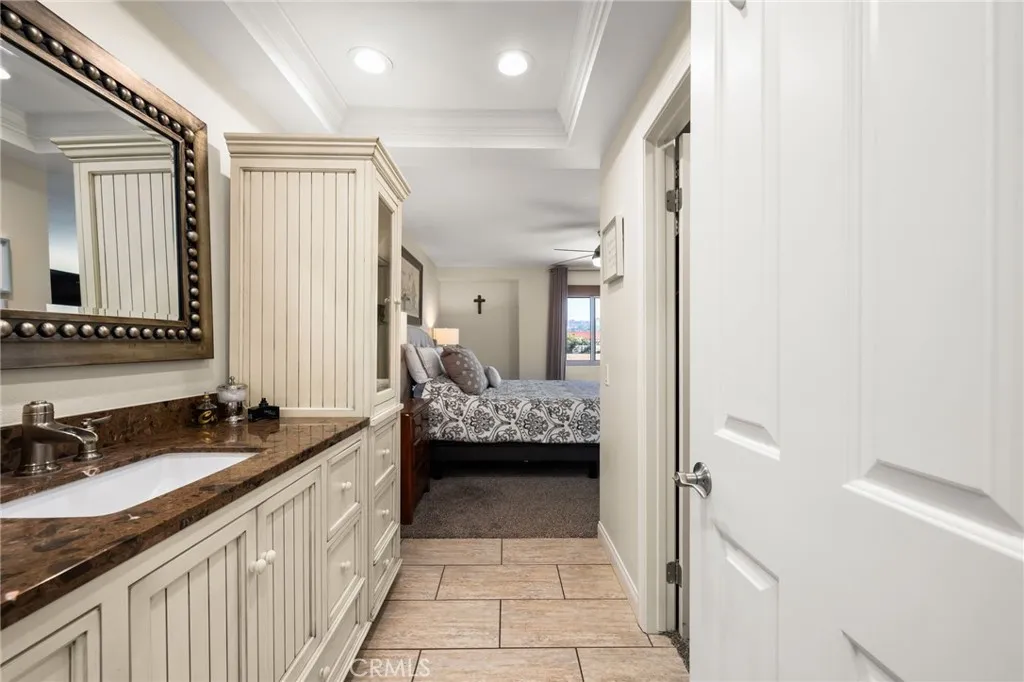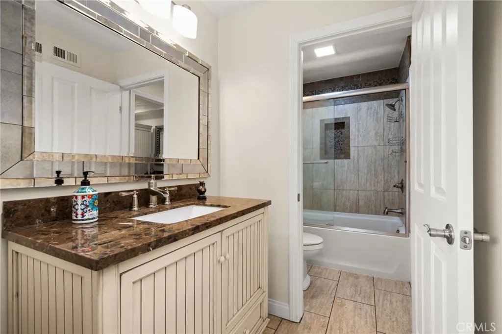 Downstairs also includes a full bath, beautifully updated with a custom-tiled tub/shower combo, glass enclosure, and a high-end stone vanity.