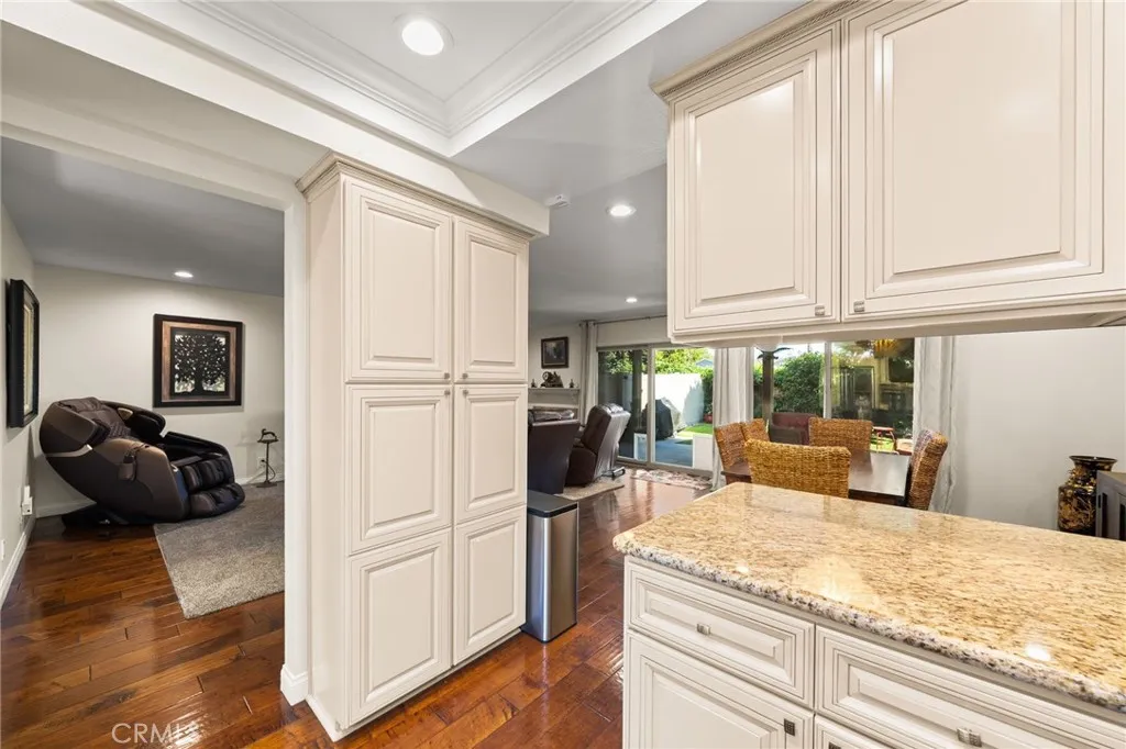 The gourmet kitchen is a chef’s dream—featuring solid wood cabinetry, granite countertops, stainless steel appliances, designer backsplash, and a charming view of the lush courtyard through the front window.