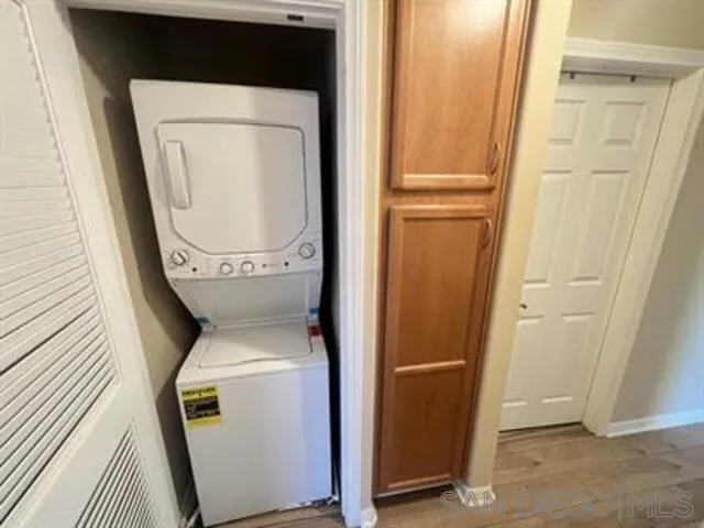 This charming upstairs townhome located in the desirable gated community of Balboa Ridge. This home offers a perfect blend of style, comfort, and convenience. Enjoy a spacious living room with vaulted ceilings and hardwood flooring throughout, complemented by brand new carpet in both bedrooms. The modern kitchen features granite countertops and stainless steel appliances, perfect for home chefs. Additional highlights include split A/C units, an in-unit stackable washer and dryer in a dedicated laundry closet, and a private balcony accessible from the living room—ideal for relaxing or entertaining. This unit includes one assigned parking space and access to community amenities such as a pool. Located within walking distance of shops, restaurants, and more, this home offers the best of Clairemont Mesa living.