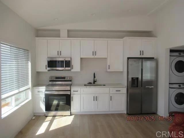 Upstairs gated apartment in a small complex of 4 units. Newer appliances, flooring, paint, window coverings, refrigerator and a washer and dryer are included, water, sewer and trash are also included in the rent. Bight and light open living room, spacious unit.