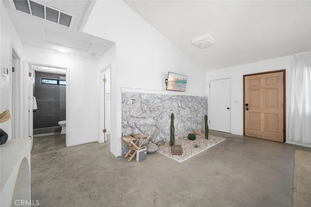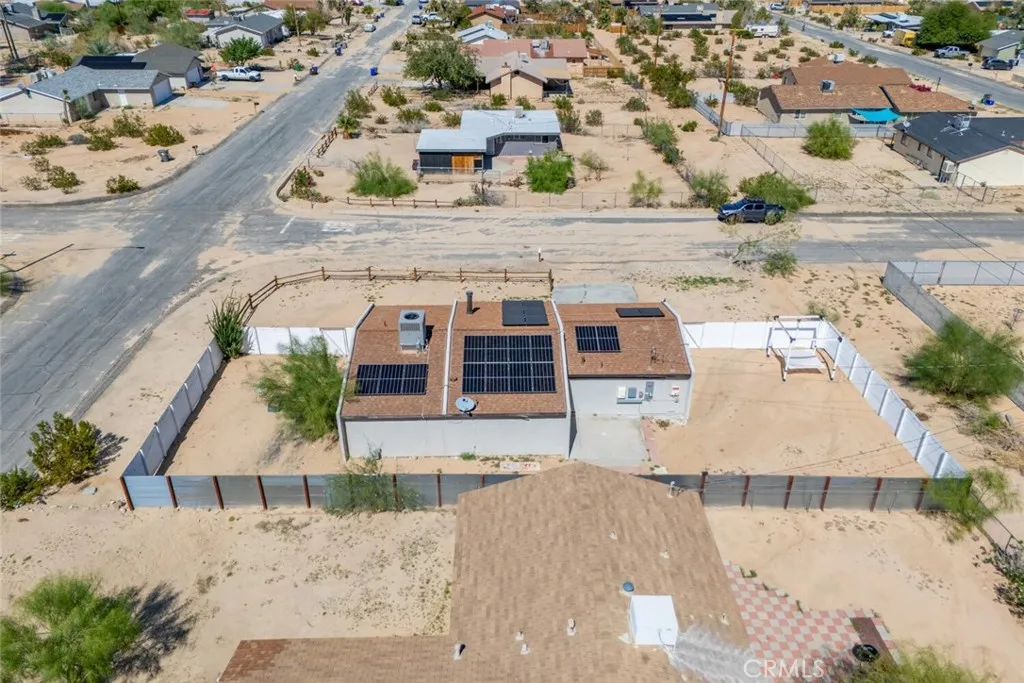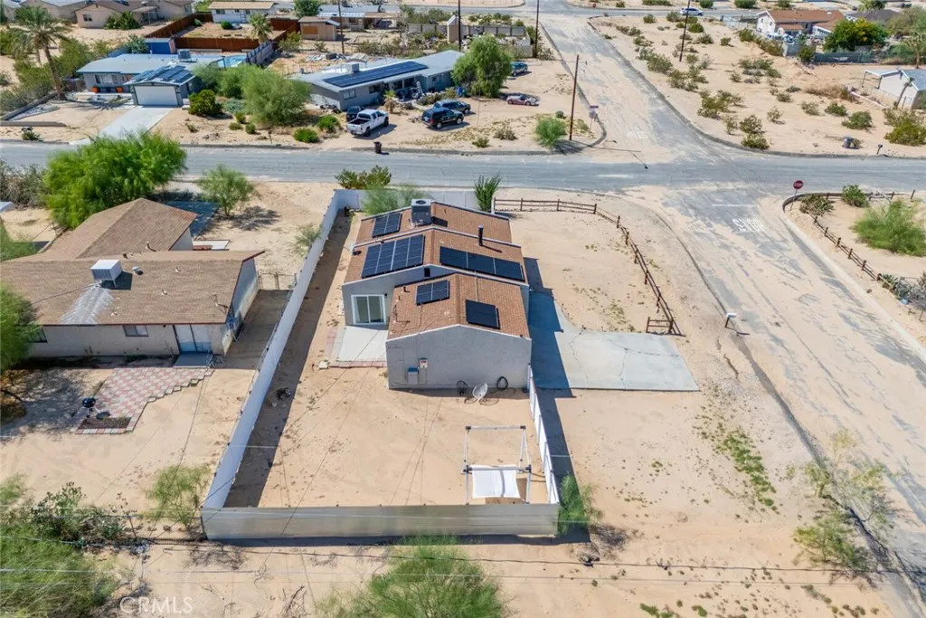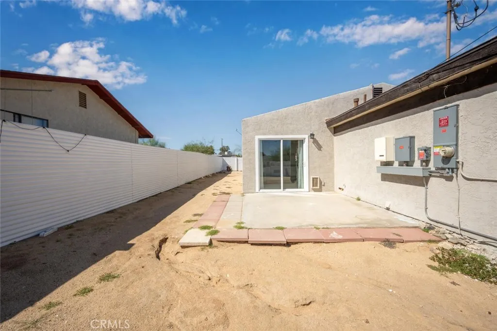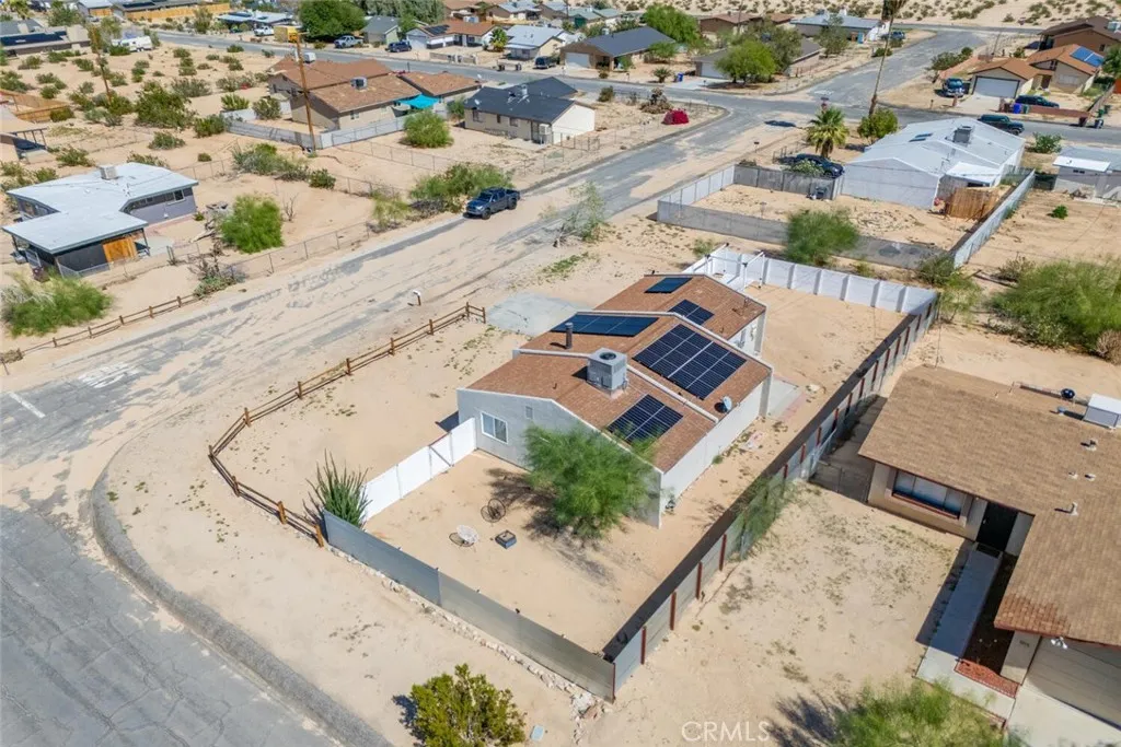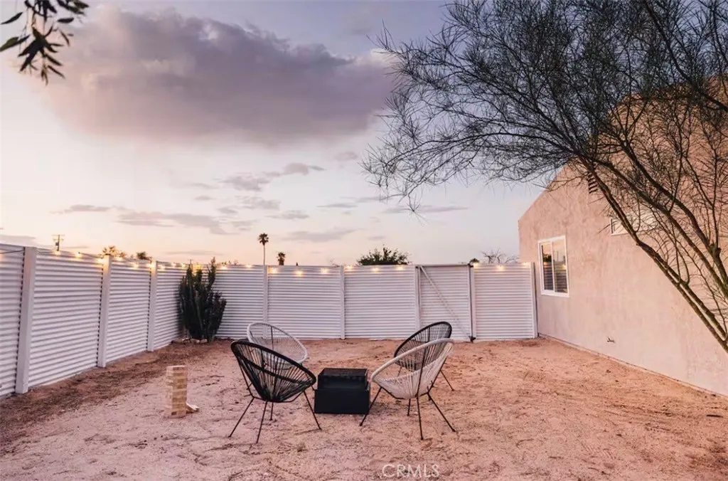 Nestled in a quiet, sunlit neighborhood just minutes from the north entrance of Joshua Tree National Park, this 2-bedroom, 1-bath home presents a seamless blend of modern comfort and relaxed desert charm. As you enter, you’ll feel the calm of the neutral color palette, soft natural light, and an open layout that creates a sense of effortless flow. The living and dining areas are connected, making it easy to host or lounge with ease. Vaulted ceilings add roomy height, and updated windows bring in gentle breezes and desert views. The kitchen is well appointed and designed to be both functional and welcoming. Ample cabinetry, updated appliances, and a breakfast nook/open dining spot near the back patio make daily life comfortable and inviting. Each bedroom retains a serene, understated feel while being flexible enough for guest or personal use. The bathroom is clean and bright, with an expanded walk-in shower newly tiled to the ceiling. Outdoor living is effortless — step out to the patio for morning coffee or evening stargazing. The fenced yard invites desert landscaping, creative outdoor setups, or relaxing in privacy. Located close to local shops, easy access routes, and the natural wonders of the high desert, it offers both serenity and convenience; this home is an ideal full-time residence, desert getaway, or investment opportunity.