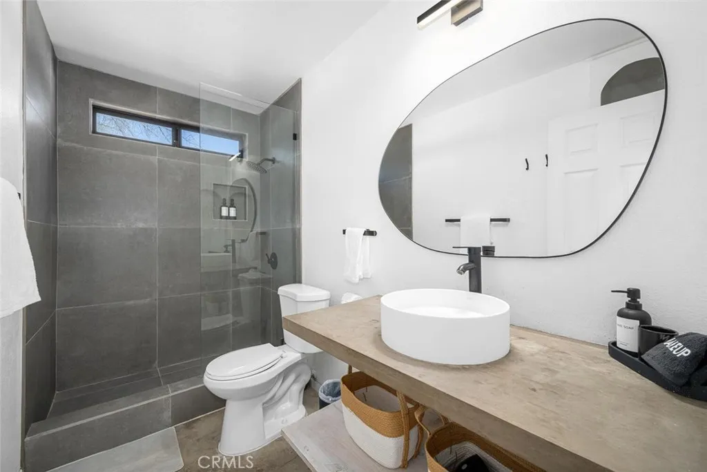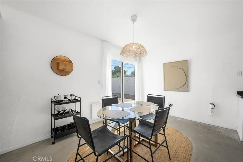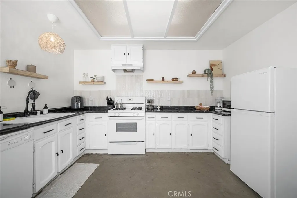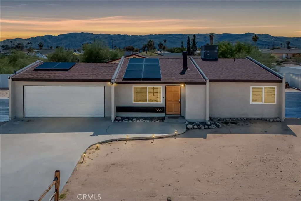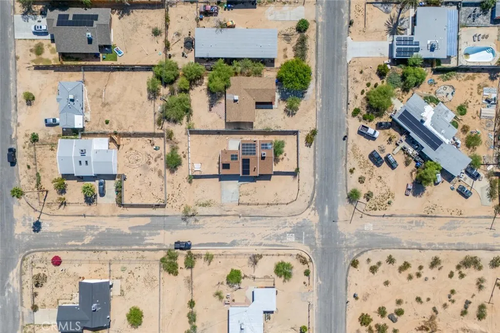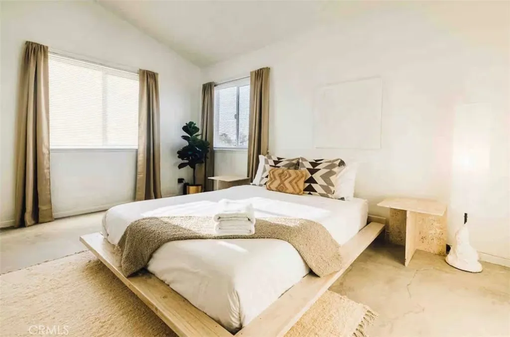 Nestled in a quiet, sunlit neighborhood just minutes from the north entrance of Joshua Tree National Park, this 2-bedroom, 1-bath home presents a seamless blend of modern comfort and relaxed desert charm. As you enter, you’ll feel the calm of the neutral color palette, soft natural light, and an open layout that creates a sense of effortless flow. The living and dining areas are connected, making it easy to host or lounge with ease. Vaulted ceilings add roomy height, and updated windows bring in gentle breezes and desert views. The kitchen is well appointed and designed to be both functional and welcoming. Ample cabinetry, updated appliances, and a breakfast nook/open dining spot near the back patio make daily life comfortable and inviting. Each bedroom retains a serene, understated feel while being flexible enough for guest or personal use. The bathroom is clean and bright, with an expanded walk-in shower newly tiled to the ceiling. Outdoor living is effortless — step out to the patio for morning coffee or evening stargazing. The fenced yard invites desert landscaping, creative outdoor setups, or relaxing in privacy. Located close to local shops, easy access routes, and the natural wonders of the high desert, it offers both serenity and convenience; this home is an ideal full-time residence, desert getaway, or investment opportunity.