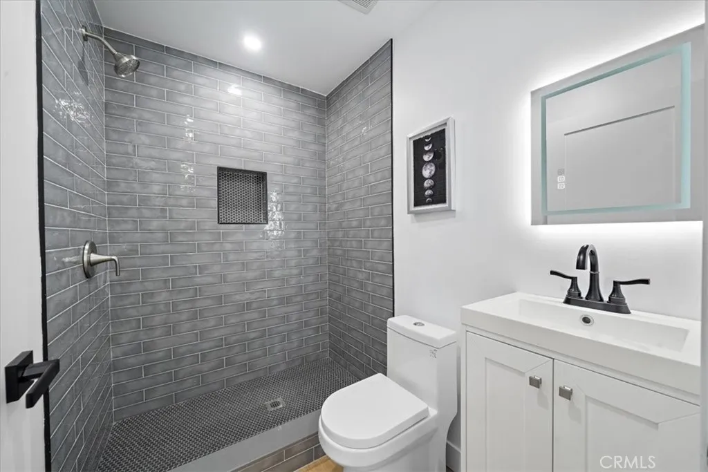 The newly built primary suite, approximately 500 square feet, feels like its own private retreat. It features an oversized shower with beautiful tilework, a dual-sink vanity, and a spacious walk-in closet. The other bathrooms are just as polished, with modern vanities and sleek fixtures throughout.