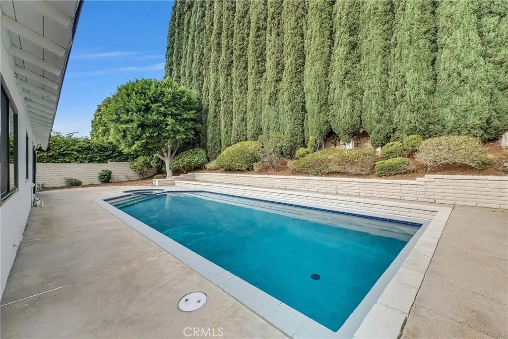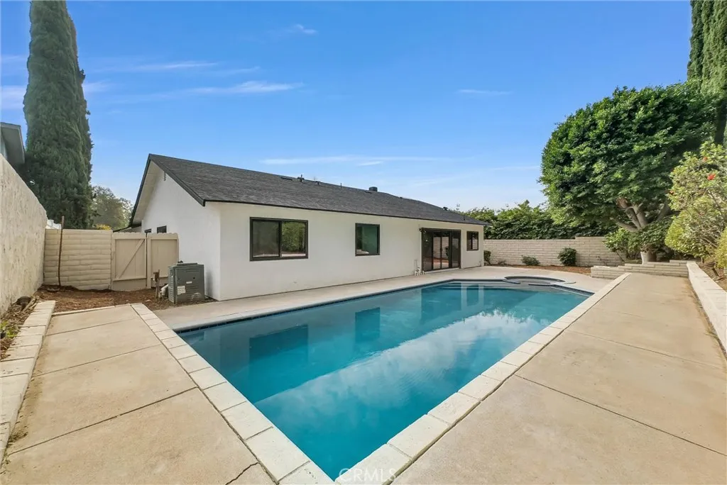 Modern conveniences include central air and heat, plus a two-car garage with rollup door. The backyard features a refinished swimming pool surrounded by mature landscaping, perfect for California outdoor living.