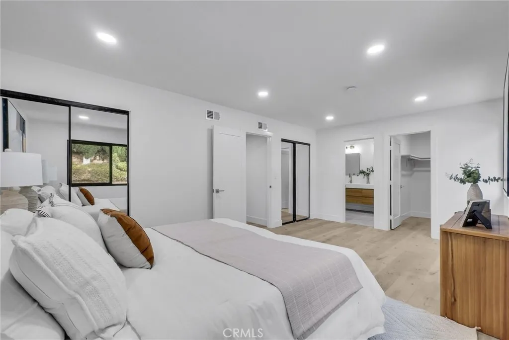 The primary bedroom includes a walk-in closet and an updated bathroom with porcelain and quartz tiled shower surround, dual shower heads, frameless glass doors, quartz flooring, and dual sinks. Three additional bedrooms feature mirrored wardrobe doors and matching laminate flooring. The hall bathroom offers porcelain tile around the tub, dual sinks, and quartz flooring.