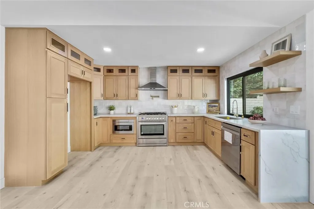 The spacious living room centers around a welcoming fireplace, flowing into a generous dining area and gourmet kitchen. The kitchen features stainless steel appliances, including a commercial-style gas range and drawer microwave, complemented by light oak shaker cabinetry, quartz countertops, and porcelain tile backsplash. Light oak plank laminate flooring and recessed lighting enhance the modern aesthetic throughout.