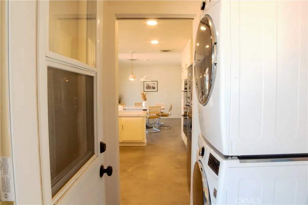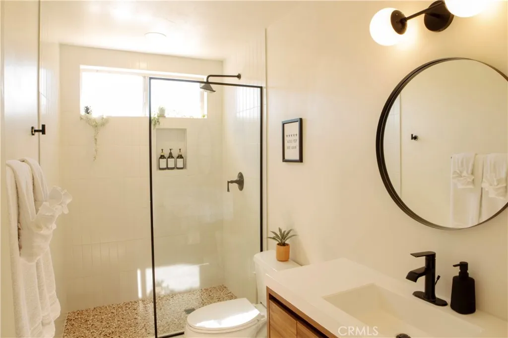 Classic Midcentury Charm, Floor plan and Architecture with sunken living room. Midcentury charm starts with curb appeal, this home is set back from the street, centered on a square 1.4 acre lot. A long-looped driveway through lush hi-desert plants and bushes including large Joshua Trees and a large rear facing garage, a classic feature of Yucca Valley homes because of their large lots and relaxing lifestyle, most commonly built by early developer Fred A. Storey. The face of the home features rock masonry, exposed beams and eaves, a welcoming front patio and breezeway. The entry features double doors, paneled and carved. The entry looks on to a sunken living room, a giant window with beamed ceilings and a grand rock fireplace. The home has polished concrete floors throughout. To the right a den/office/bedroom with an ornate door. Forward through a pocket door is an open concept kitchen, dining room and laundry room with doors to the yard and breezeway. The bedroom wing hall has a large bank of built cabinets for extra storage. The guest bathroom is large and remodeled with terrazzo tile floors, floating vanity and a walk-in shower. The guest bedroom is large, with a large closet and windows. The primary bedroom is very large, with a walk-in closet, and remodeled full bath. The yard is big, the amenities spaced out with large Joshua Trees and pathways and wide views of Joshua Tree National Park Mountains. The large rear facing garage with its huge glass door and finished game room interior and mini split for heating and cool it’s the perfect place to enjoy the view and preside over a gathering enjoying the pool, spa, sauna and sundeck.
